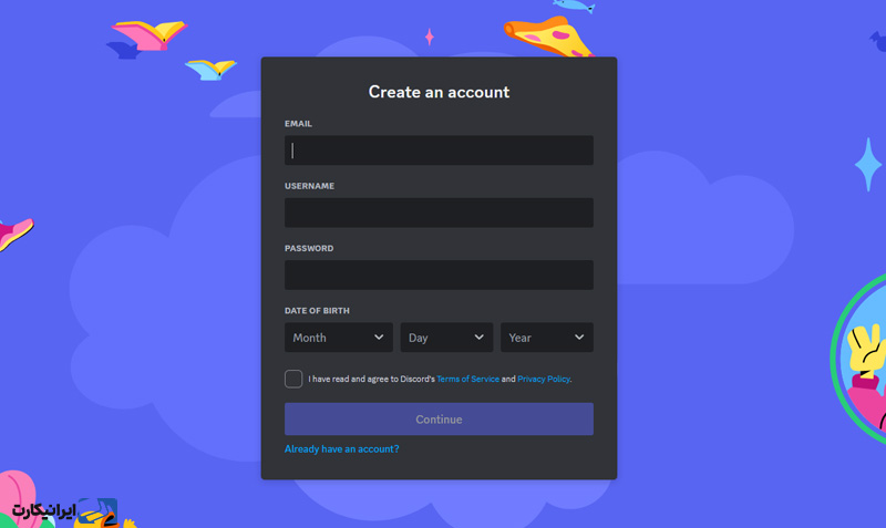3- ایمیل، اسم، پسورد و تاریخ تولد خود را وارد کرده و با تایید قوانین این سایت روی continue کلیک کنید.