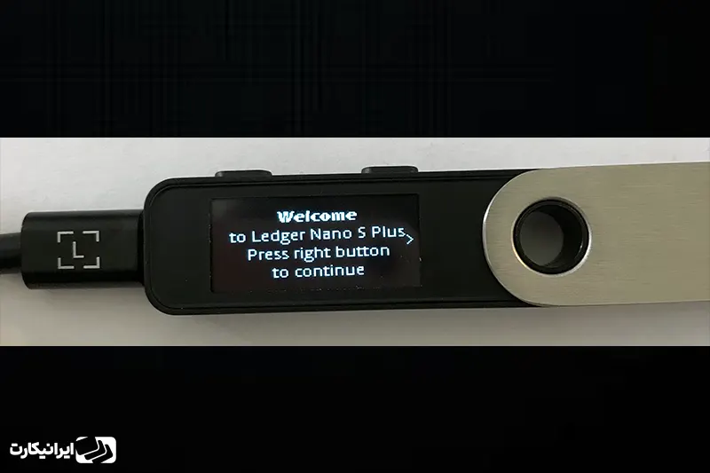 - ابتدا دستگاه خود را به کمک USB-C ارائه شده به رایانه خود وصل کنید تا جمله به Welcome to Ledger Nano S Plus خوش آمدید نمایان شود. برای ادامه دکمه سمت راست را فشار دهید.
