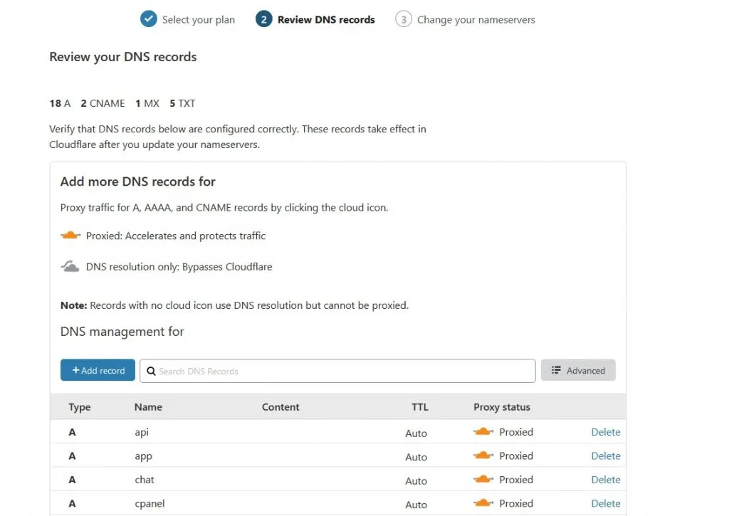در این مرحله، لیستی از تمام رکوردهای DNS برای دامنه وب سایت شما، از جمله ساب دامینها، نمایش داده میشود. اگر نیاز به ایجاد یک رکورد جدید دارید، میتوانید با کلیک روی Add Record، یک رکورد مرتبط اضافه کنید. در این مرحله میتوانید تصمیم بگیرید که کدام زیردامنه را میخواهید فعال یا غیرفعال کنید. پس از تأیید سوابق DNS خود، روی Continue کلیک کنید.