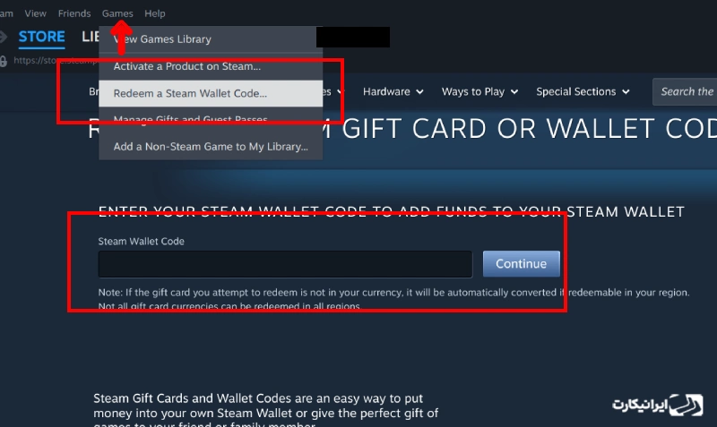 برای این کار ابتدا باید از قیمت بازی موردنظر خود مطمئن شوید و ریجن اکانت استیم خود را نیز بدانید. سپس از پلتفرمهای معتبر و خوشسابقه مثل ایرانیکارت، گیفت کارت مطابق با ریجن و قیمت موردنیاز خود پیدا کنید. درنهایت، پساز کلیک روی گزینه «Redeem a Steam Wallet Code» در منوی «Games» از بخش بالایی رابط کاربری، کد فعالسازی گیفت کارت تهیهشده را در قسمت مربوطه وارد کنید.