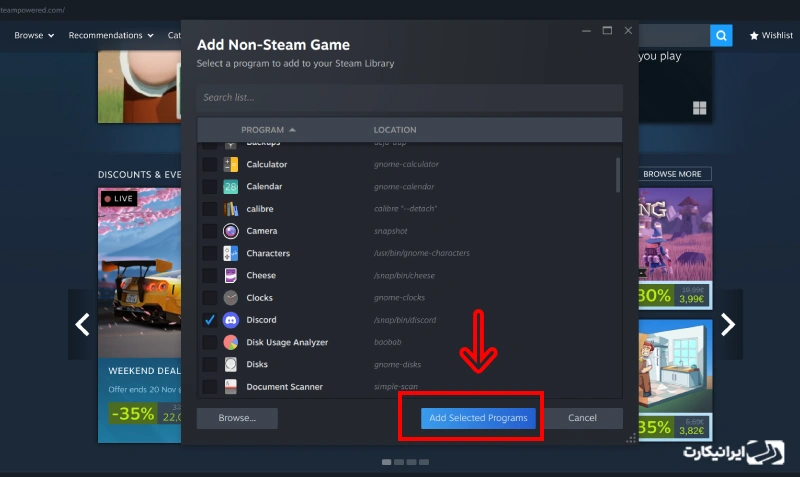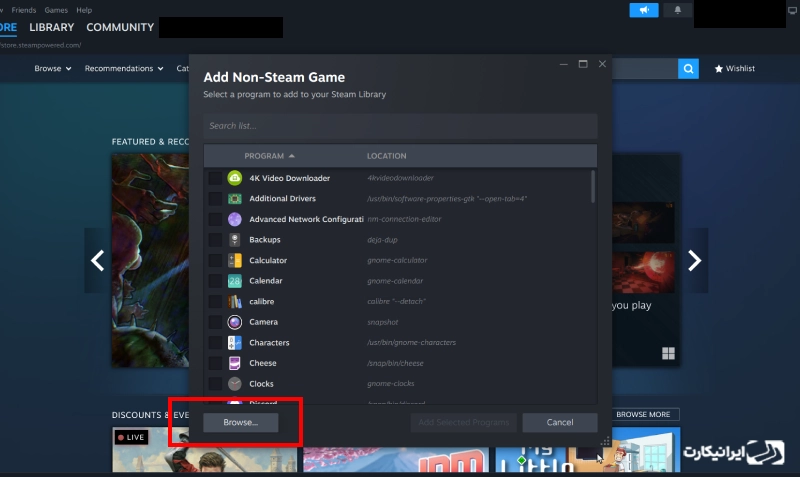 با کلیک روی گزینه «Add a Non-Steam Game»، یک پنجره جدید باز میشود که در آن کل برنامههای نصبشده روی کامپیوتر یا لپتاپ فهرست شدهاند. پساز پیداکردن اسم و آیکون بازی موردنظر، تیک کنار آن را فعال کنید و گزینه «Add Selected Programs» را بزنید.