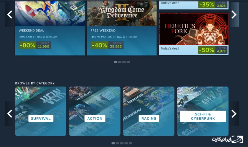 با کلیک روی این گزینه شما به صفحه پیشخوان فروشگاه استیم، حاوی انواع دستهبندیها هدایت میشوید. در این صفحه انواع بازیهای پیشنهادی و پرفروش، بازیهای رایگان، دستهبندیهای مختلف براساس ژانرها و البته جدیدترین بازیهای منتشر شده استیم را مشاهده خواهید کرد: