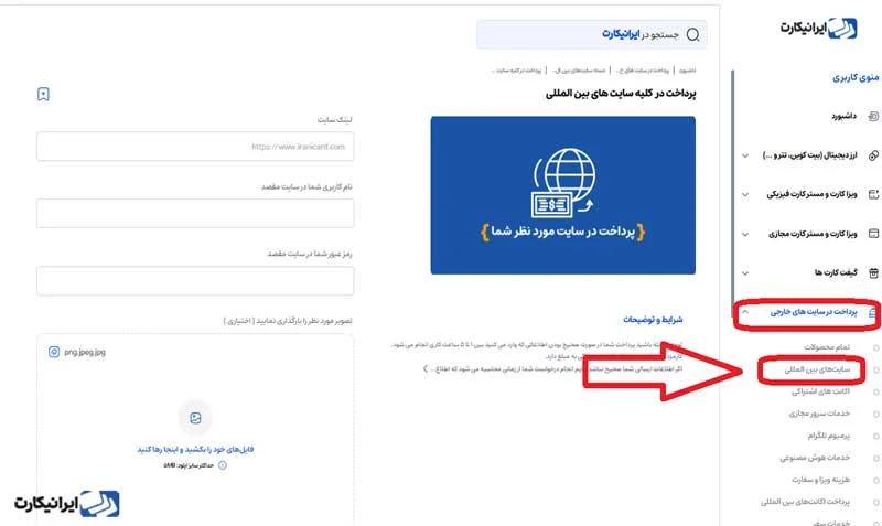 در منوی کاربری، ابتدا روی گزینه «پرداخت در سایت‌های خارجی» و سپس روی «سایت‌های بین‌المللی» کلیک کنید.