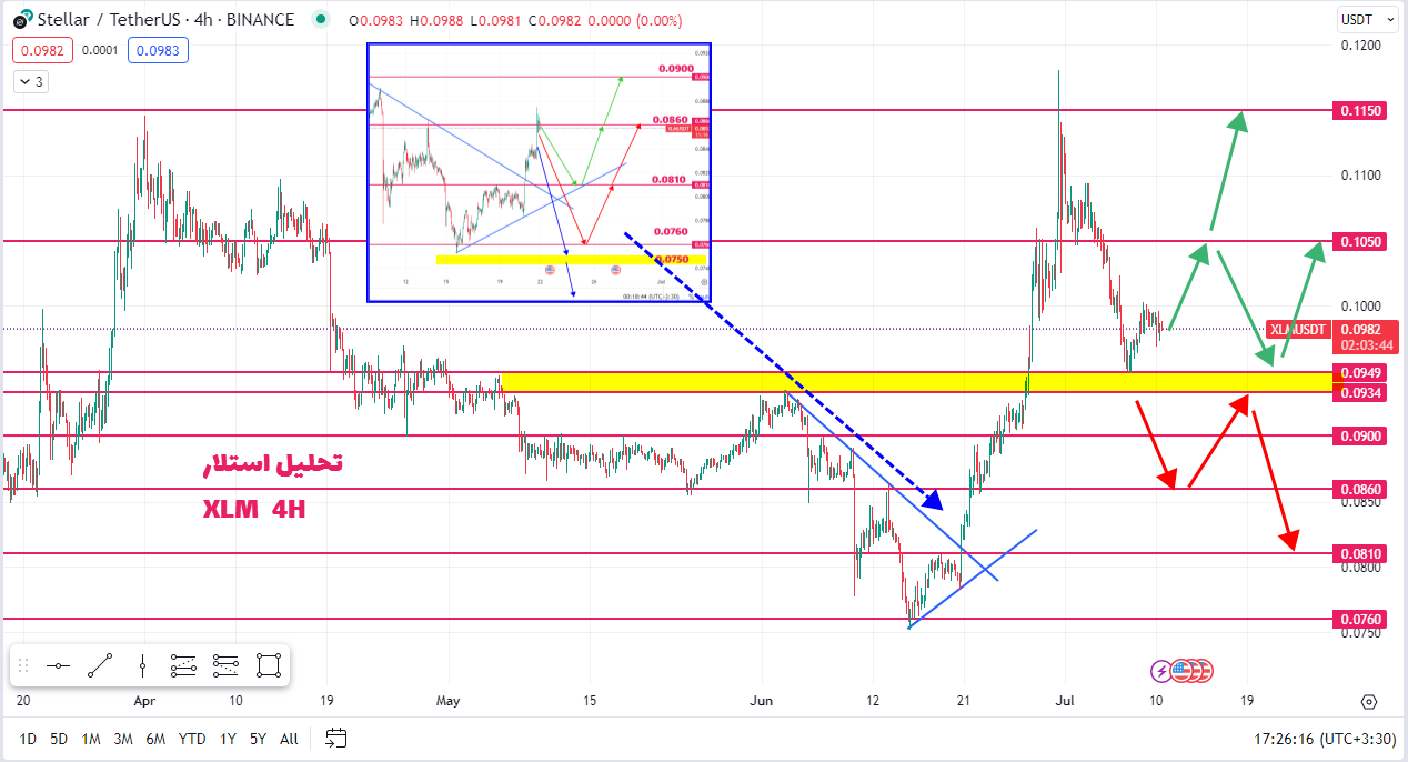رفقا بعضی قیمت های هستن که سقف و کف های فوق العاده ای تشکیل میدن، همانطور که در چارت قبل و چارت این قسمت مشخصه قیمت های 0.095 و 0.115 که با هایلایت زرد رنگ مشخص شدن از این قبلی مناطق و قیمت ها هستن که اگر شکسته بشن رمزارزها حرکتهای بسیار خوبی در همون راستا میزنن. نمونش همین رمزارز استلار