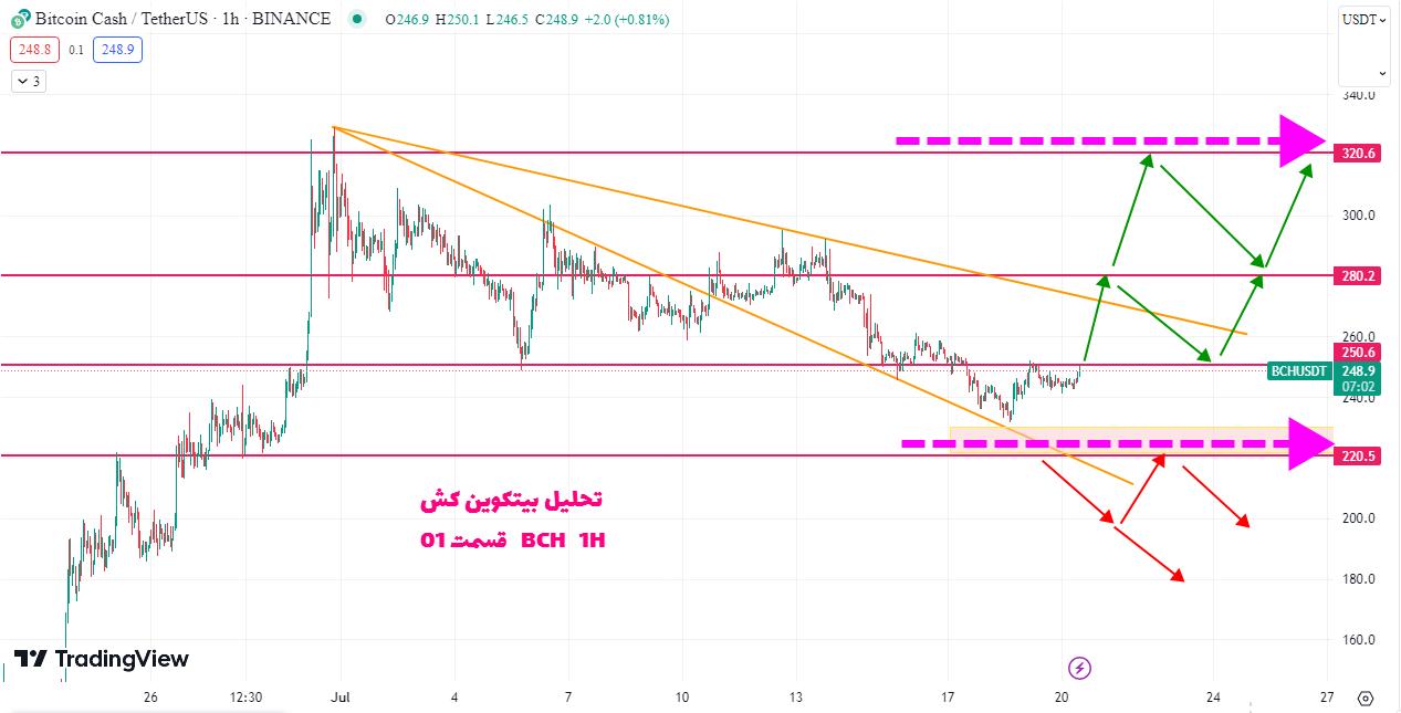 - اول بریم سراغ تحلیل بیتکوین کش. قسمت اول هست بنابراین چارت قسمت قبل نداریم اما چارت تایم فریم بالا داریم