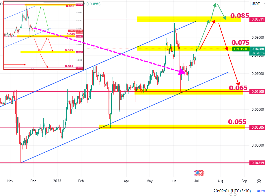 خب رفقا ببینید، در قسمت قبل قیمت حدوده 0.075 بود اواسط یک کانال صعودی، طبق سناریوی سبزرنگ پیش بینی کردیم که قیمت طبق فلش سبز رنگ میتونه تا قیمت 0.085 و بالا تر بره و در غیر اینصورت میتونیست سناریوی قرمز رنگ اتفاق بیفته