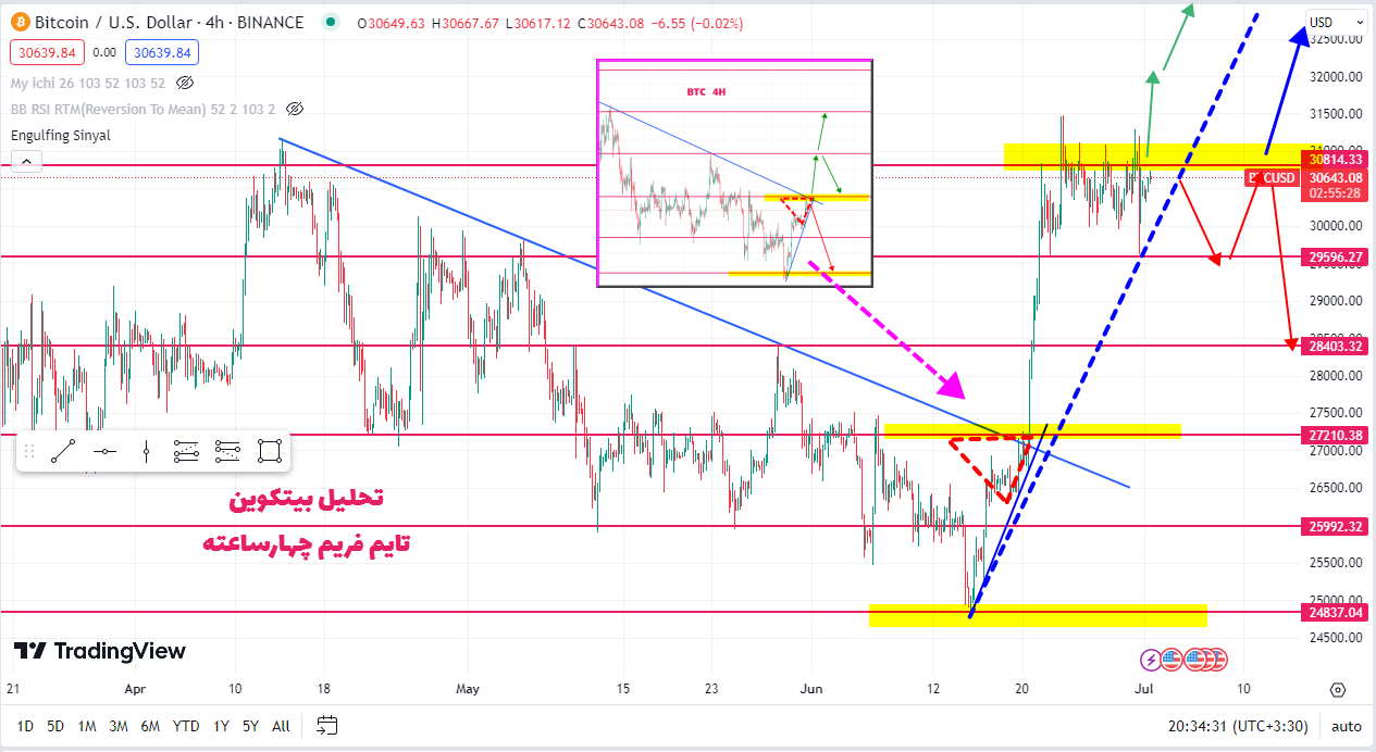 همونطور که در چارت زیر میبینید قیمت بالا اومده بود تا محدوده ی مقاومتی زرد رنگ 31000. و گفتیم که این محدوده ی مهمی هست و قیمت طبق فلش اول میتونه تا محدوده 32000 بالا بره و اگر محدوده 31500 تا 32000 به سمت بالا بشکنه میتونه تا 34000 هم افزایش پیدا کنه. یک خط روند آبی نقطه چین هم داشتیم که اگر میشکست قیمت میتونست ساید یا نزولی بشه