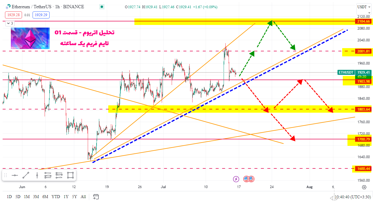 یه کار منطقی که برای اتریوم میشه انجام داد اینه که صبر کرد تا قیمت خط بنفش رنگ را به سمت بالا بشکنه و با شروع روند صعودی روی اون سوار شد و با اون همراه شد یعنی یک گزینه منطقی این هست که قیمت بیاد و مطابق اولین فلش سبز رنگ به سمت بالا حرکت کنه تا 1900 یا بیاد پایین تا قیمت 1700 و بعد خط بنفش را بسمت بالا بشکنه و تا قیمت ۱۸۰۰ بالا بیاد