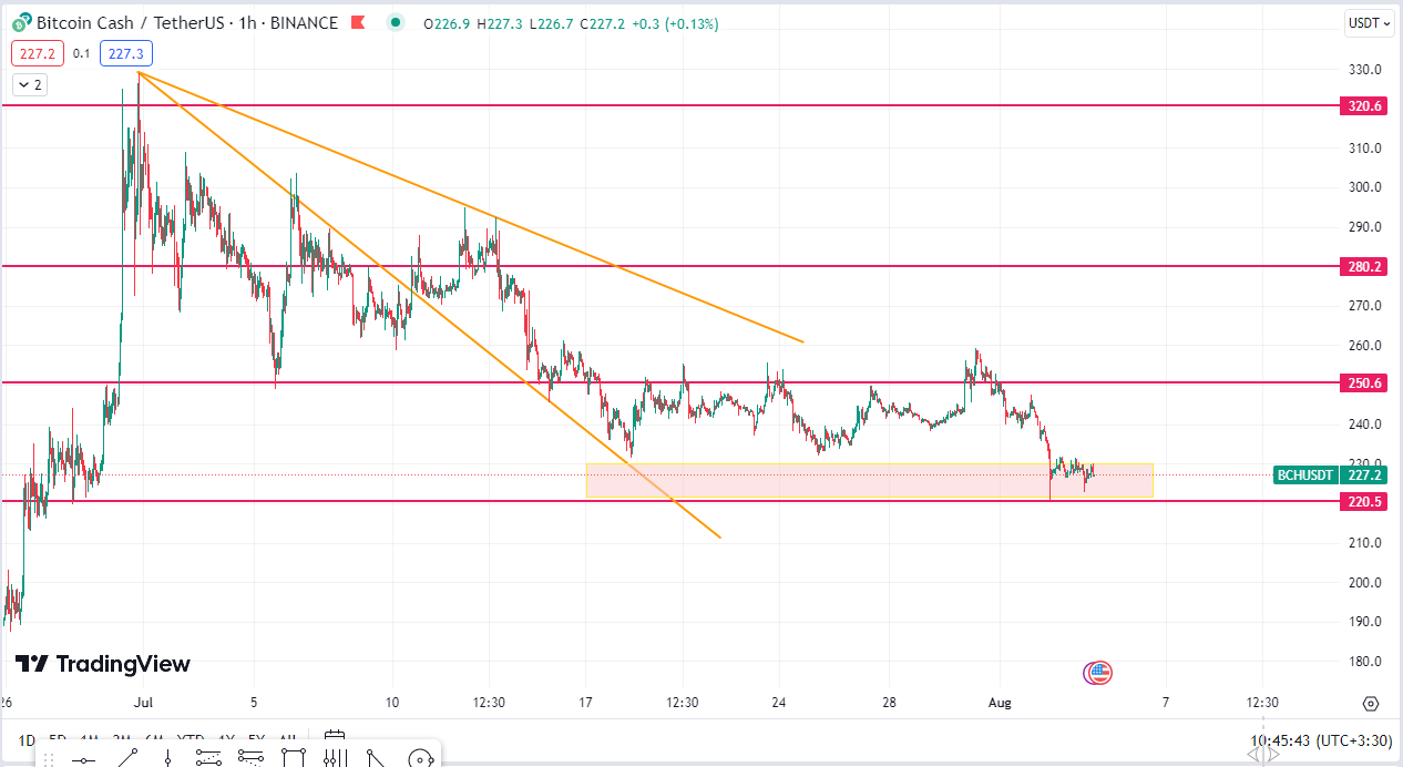 همانطور که در چارت بالا مشاهده میکنیم قیمت در یک روند نزولی قرار داشت و به محدوده ۲۲۰ برخورد کرده بود و دو تا سناریو داشتیم سناریوی ریزشی قرمز رنگ و سناریوی صعودی سبز رنگ