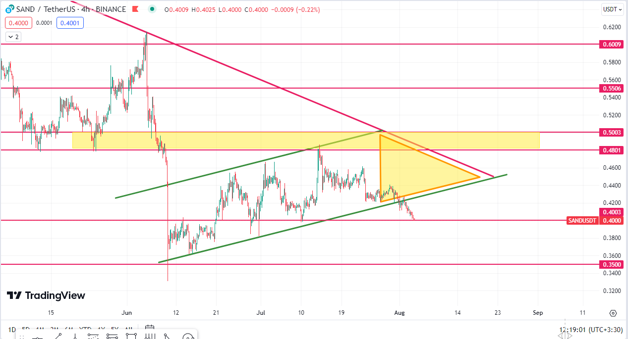 خوب همونطور که در چارت بالا مشاهده میکنیم قیمت مثلث را به سمت پایین شکست و پشت ناحیه حمایتی ۰.۴۰۰۰ رسیده.