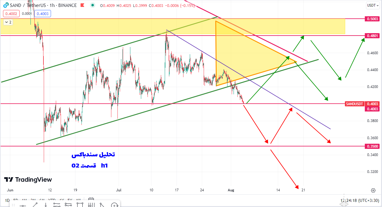 سناریوی قرمز میگه چنانچه قیمت محدوده صفر.۴۰۰۰ را به سمت پایین بشکنه میتونه تا پله پایین بعدی یعنی ناحیه حمایتی ۰.۳۵۰۰ کاهش پیدا کنه. به به دلیل اینکه قیمت کف کانال صعودی سبز رنگش را به سمت پایین شکسته میتونیم یک خط روند نزولی بنفش رنگ برای اون رسم کنیم و تا زمانی که این خط شکسته نشه قیمت به روند نزولی خودش ادامه میده