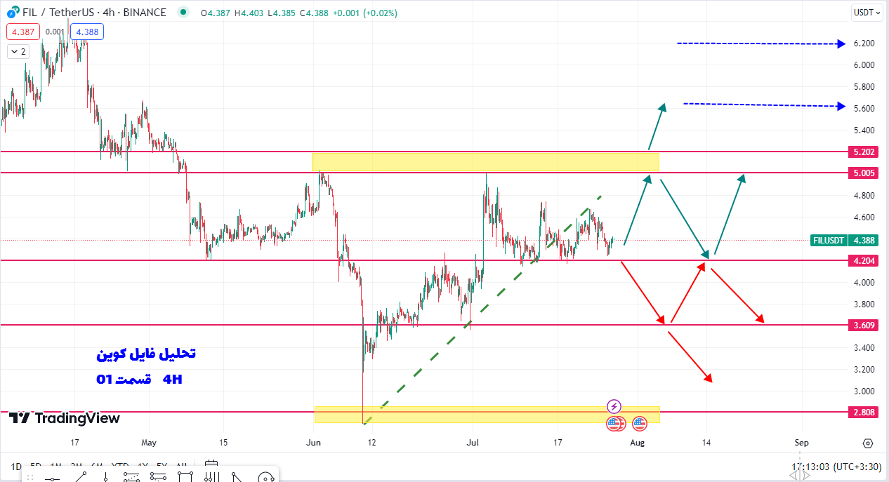 سناریوی سبز رنگ میگفت قیمت در محدوده ۴.۲ تا ۵.۲ به حرکت ساید خودش ادامه میده و در صورتی که مقاومت ۵.۲ را به سمت بالا بشکنه میتونه به اهداف بالاتر برسه
