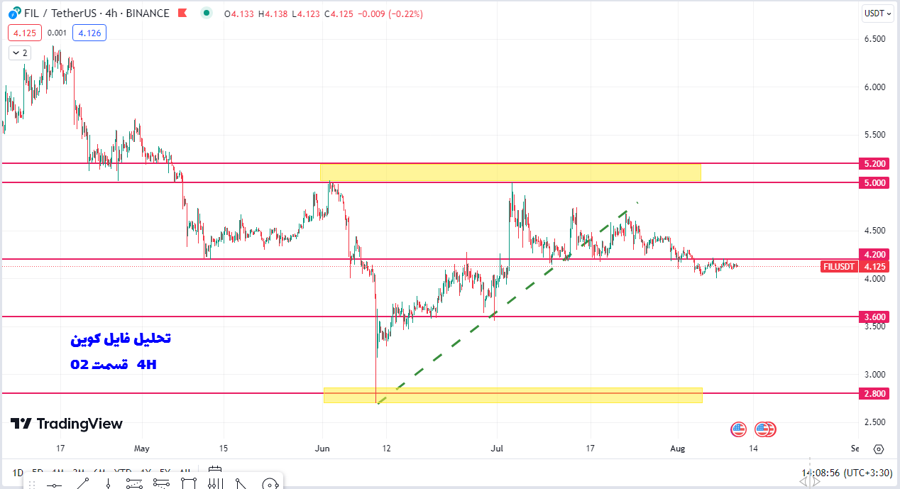 خوب چارت این قسمت رو در پایین مشاهده میکنید. همونطور که در چارت این قسمت میبینید قیمت اومده و از محدوده ۴.۲ کاهش پیدا کرده یعنی سناریوی قرمز رنگ ما الان در حال سپری شدن هست. البته به این توجه کنیم که قیمت نتونسته قوی به سمت پایین بیاد و اون منطقه حمایتی رو قوی به سمت پایین بشکنه این رو حتماً مد نظر داشته باشیم برای تحلیل امروز