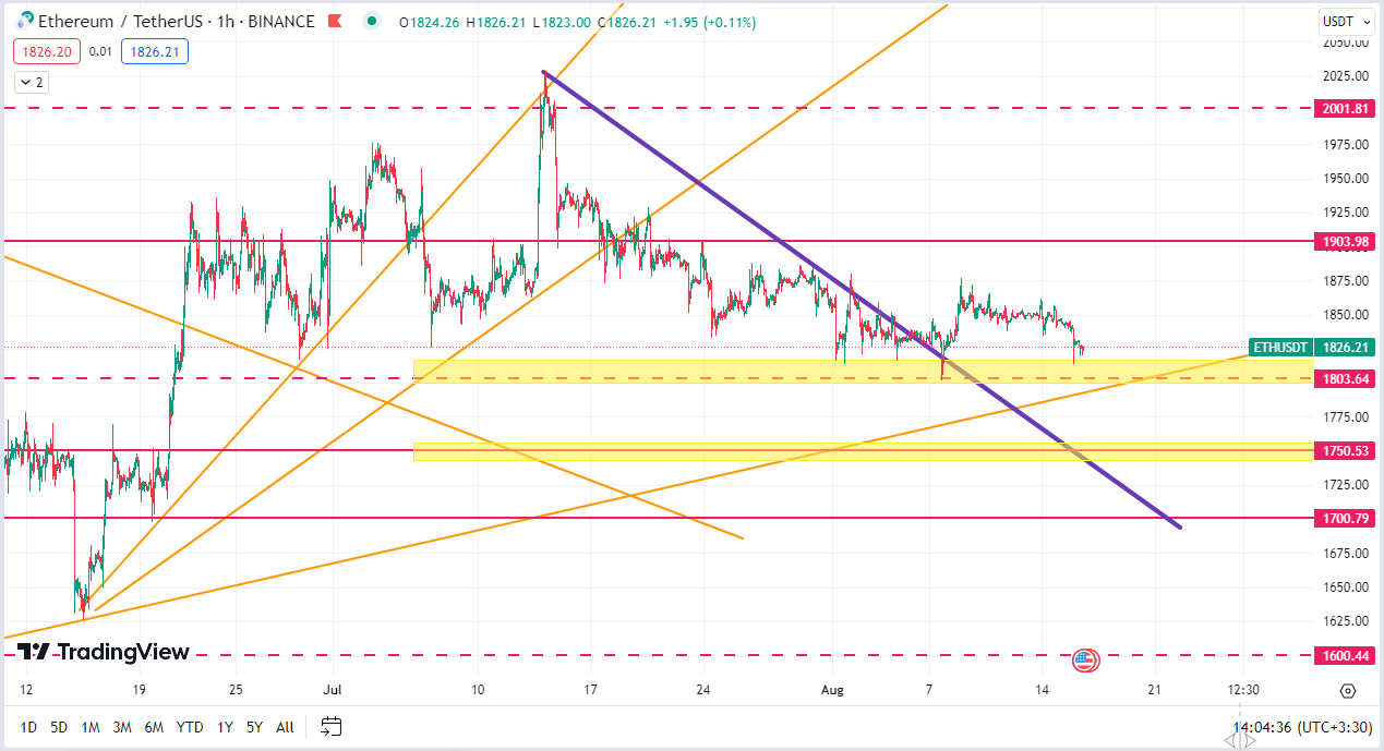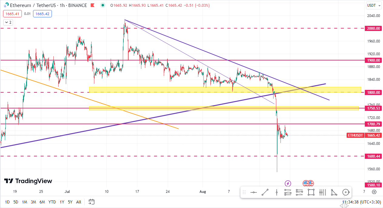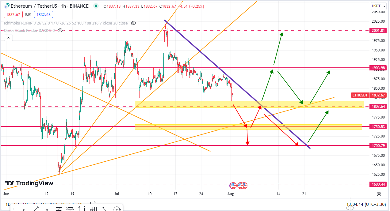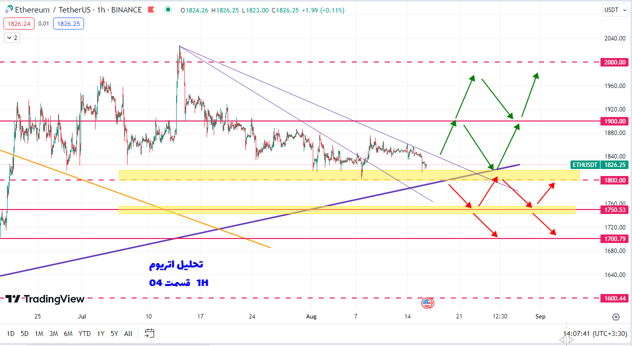 همونطور که در نمودار زیر مشاهده میکنیم قیمت به خوبی تونست بیاد و کف حمایتی ۱۸۰۰ را به سمت پایین بشکنه و سناریوی قرمز رنگ فعال بشه و اتریوم یک ریزش ۱۲ درصدی را تجربه کنه