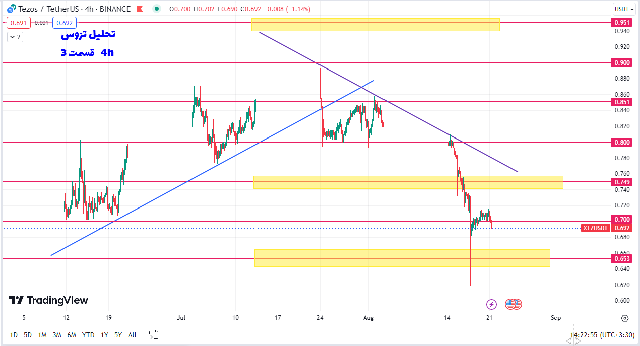 چارت زیر چارت این قسمت رمز ارز تزوس هست بچهها همونطور که میبینید تزوس کاملاً زیر خط روند نزولی بنفش رنگ خودش قرار داشت و به اون پایبند بود. تزوس به خوبی اومد و از قیمت ۸۰۰ ریخت تا محدوده ۷۵۰ و بعد از اون در یک حرکت شارپ دو پله پایینتر یعنی قیمتهای ۷۰۰ و ۶۵۰ رو هم دید.
