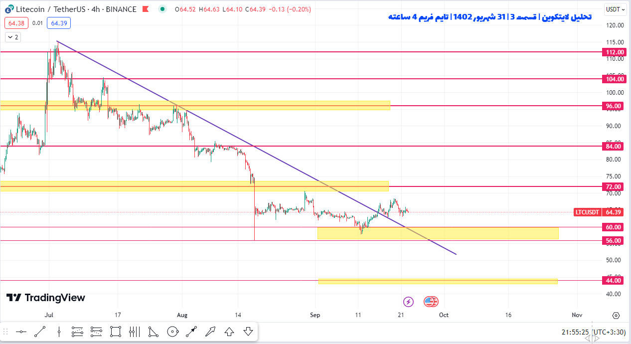 چارتی که در پایین مشاهده میکنین ادامه حرکت لایت کوین هست همونجور که میبینین کاملاً در محدوده تصمیم گیری بنفش رنگ مونده و الان فلشهای بنفش رنگ در جریان هستند یعنی قیمت لایت کوین بین محدوده ۵۶ دلار تا ۷۲ دلار در نوسان هست