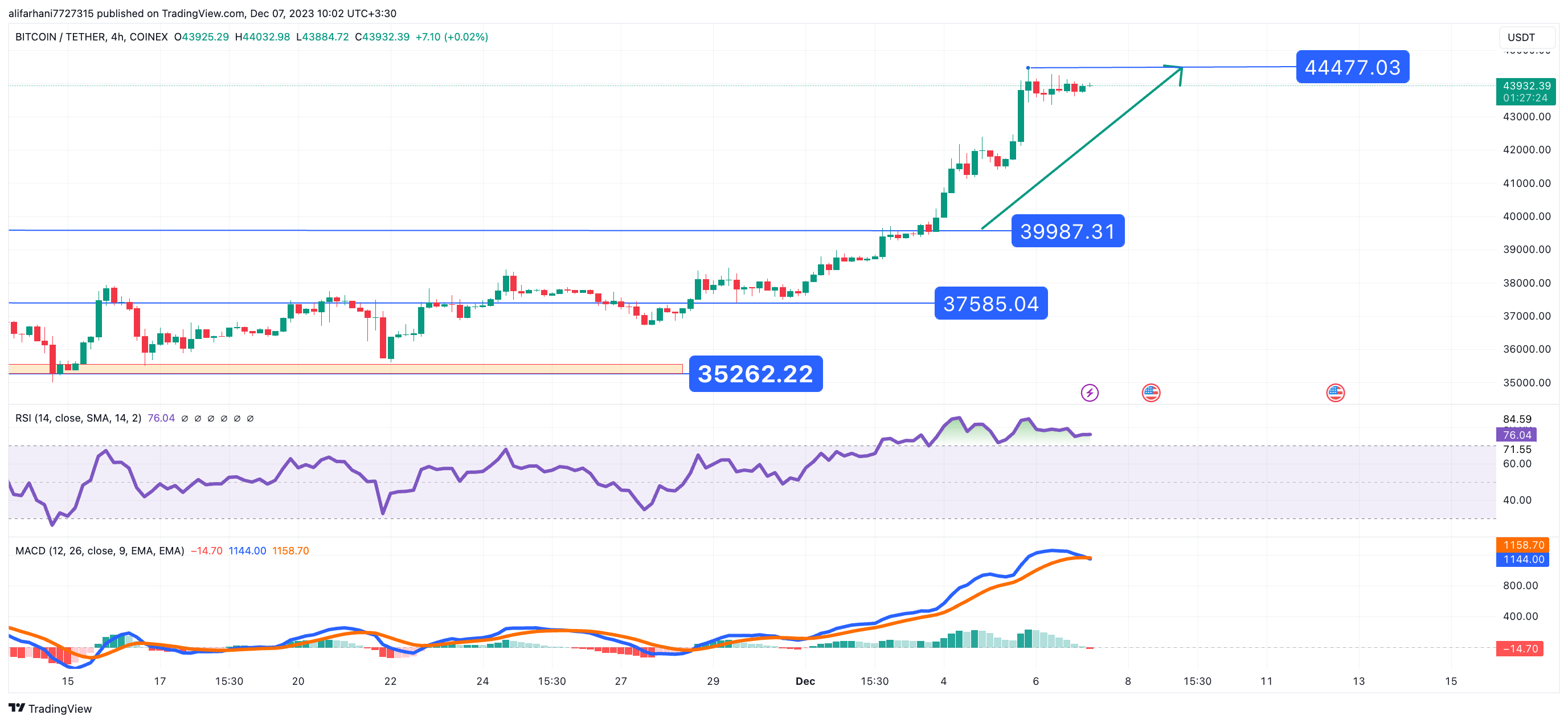 علیرغم اصلاح مختصری که منجر به سقوط بیت کوین به زیر 44000 دلار شد، گاوها در بالای منطقه حمایتی 43200 دلار انعطاف پذیری نشان دادند. این اصلاح، سطح اصلاحی فیبوناچی 23.6 درصدی صعود اخیر را آزمایش کرد، که از 39,475 دلار نوسان پایین تا قله 44,465 دلار گسترش یافت.موقعیت فعلی بیت کوین بالای 43500 دلار و SMA ساعتی 100 نشان دهنده قدرت آن است و با نگاهی به آینده، بیت کوین با مقاومت فوری در سطح 44,250 دلار، با مانع اصلی در 44,450 دلار مواجه خواهیم شد. فراتر رفتن از این سطوح می تواند راه را برای افزایش قیمت 45000 دلاری هموار کند. اگر بیت کوین به قیمت بالای 45000 دلار برسد، مقاومت قابل توجه بعدی در حدود 46200 دلار خواهد بود که به طور بالقوه بیت کوین را به سمت 47500 دلار سوق می دهد.اما در حال حاضر با توجه به روند اصلاحی اندیکاتور های MACD و RSI احتمال فاز اصلاحی کوتاه مدت تا محدوده قیمت 43000 دلار بسیار بالا خواهد بود.