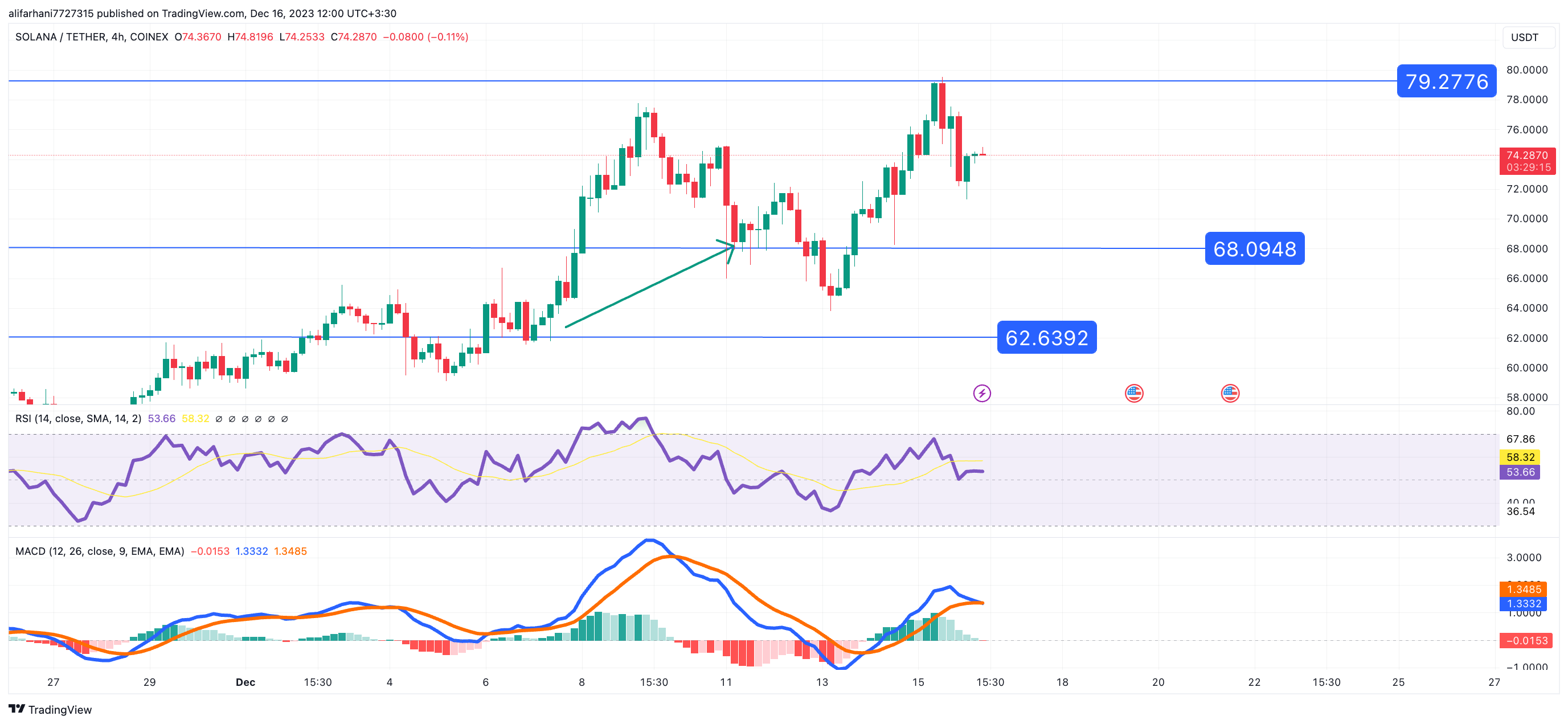 بر اساس تجزیه و تحلیل AMBCrypto از داده های Coinglass، سرمایه سرمایه گذاری شده در قراردادهای آتی فعال سولانا بیش از سه برابر شده است که از مسیر رشد قیمت تقلید می کند.اما چشم انداز فنی نمودار چهار ساعته عمدتاً نزولی است و با سیگنال فروش از شاخص واگرایی همگرایی میانگین متحرک (MACD) برجسته می شود و با توجه به روند فعلی اندیکاتور های MACD و RSI در این تایم فریم ۴ ساعته، ادامه فاز نوسانی در محدوده قمیت ۷۲ تا ۷۶ دلار پیش بینی می شود و در صورت از دست رفتن محدوده قیمت ۷۲ دلار، احتمال بازیابی قیمت به محدوده حمایتی ۶۸ دلار بسیار بالا خواهد بود، اما در صورت شکست سطح ۷۶ دلار طی ۴۸ ساعت آینده، محدوده قیمت ۷۹ دلار به اولین تارگت صعودی سولانا تبدیل خواهد شد.