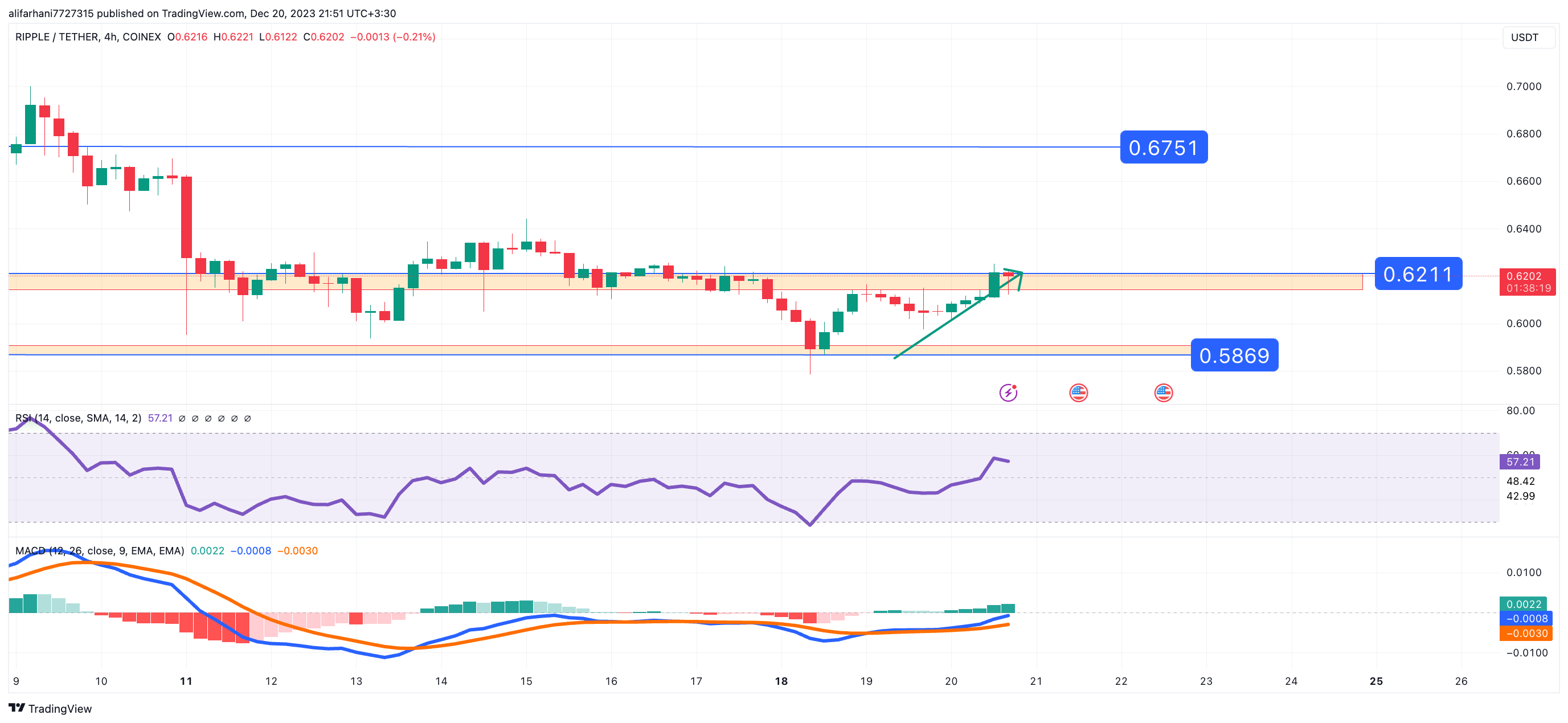 در زمان نگارش این تحلیل تکنیکال، ریپل با قیمت 0.6125 دلار معامله می شود که بر اساس داده های CoinMarketCap، در 24 ساعت گذشته بیش از ۴ درصد افزایش یافته است. همچنین حجم معاملات 3.68 درصد صعود کرده است. قیمت این رمزارزدر 18 دسامبر در سطح 0.58 دلار حمایت شد و تغییر روند صعودی خود را آغاز کرد، اما همچنان این رمزارز با مقاومت 0.66 دلار مواجه خواهد شد در حالی که حمایت محدوده 0.58 همچنان برای ادامه روند صعودی ریپل معتبر خواهد بود، اگر طی ۴۸ ساعت آینده، اگر قیمت مجددا به زیر سطح 0.60 دلار تثبیت شود، احتمالا سطح حمایت 0.58 دلار را مجدد تجربه خواهد کرد. برعکس، اگر قیمت بتواند به بالای 0.62 دلار برسد، احتمالا دستیابی به مقاومت 0.63 دلار بسیار بالا خواهد بود.
