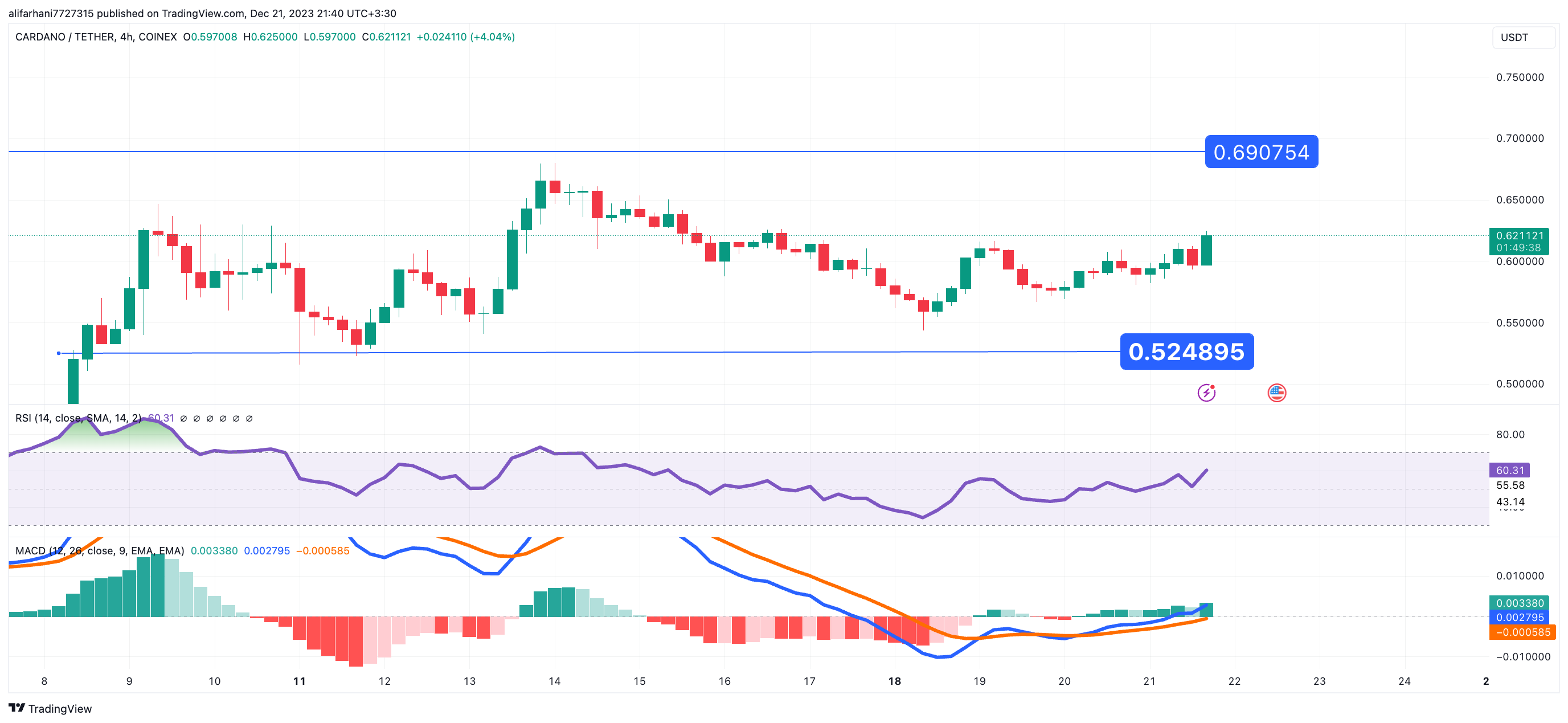 همچنین در تایم فریم ۴ ساعته عملکرد قابل توجهی در چند روز گذشته مشاهده شده است که کاردانو (ADA) نوسان قیمت بیش از ۱۴ درصد را تجربه کرده است. طبق آخرین داده های TradingView، سکه در حال حاضر با نوسانات قیمتی در محدوده 0.5870 تا 0.6090 دلار مواجه است.با بررسی شاخص های فنی، هر دو شاخص قدرت نسبی (RSI) در 63.38 و Stochastic در 63.33136 نشان دهنده وضعیت افزایشی در روند هستند و فرصتی بالقوه برای یک حرکت صعودی ایجاد می کنند. به طور همزمان، اندیکاتور Momentum در 0.050651 دلار، نشان دهنده اقدام خرید است که به احساسات مثبت می افزاید.