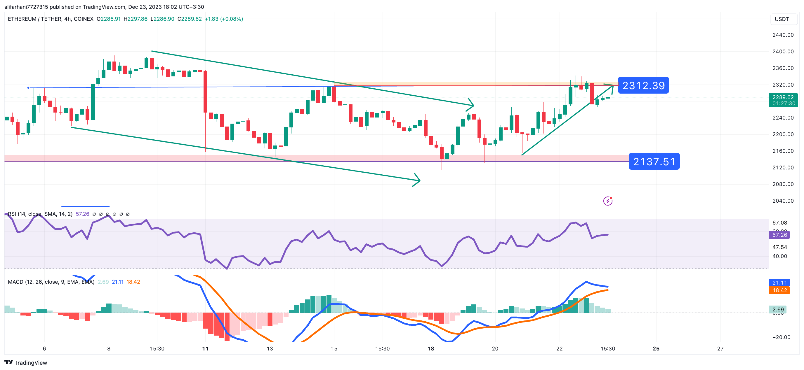 در زمان نگارش این مقاله، اتریوم با قیمت 2307 دلار معامله می شود که نشان دهنده افزایش 1.30 درصدی در 24 ساعت گذشته است.با نگاهی به آینده، گمانهزنیهایی وجود دارد که اتریوم ممکن است در هفتهها یا ماههای آینده به بالاترین حد خود برسد و به طور بالقوه پس از هاوینگ بیتکوین از مرز 5000 دلار عبور کند.در حال حاضر، مردم به طور کلی به قیمت آتی اتریوم خوش بین هستند و شاخص ترس و طمع در 70 است که نشان دهنده حس طمع در بین سرمایه گذاران است.اما با توجه به روند فعلی اندیکاتور های این رمزارز در تایم فریم ۴ ساعته، احتمال اصلاح مجدد قیمت دور از ذهن نخواهد بود.