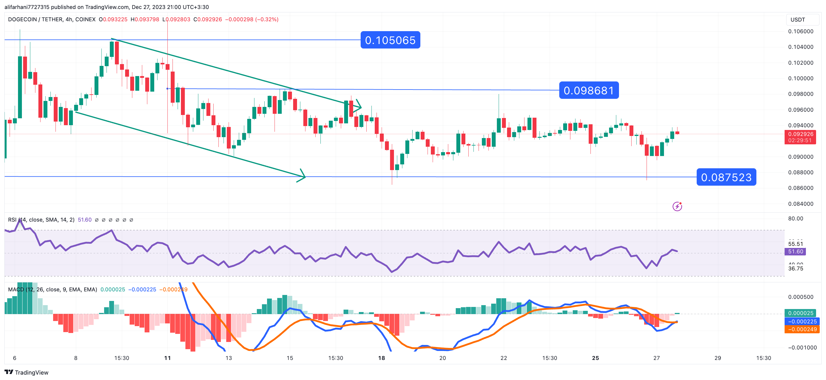 تحلیل تکنیکال دوج کوین ۱۴۰۲/۱۰/۰۵، ادامه فاز نوسانی خنثی