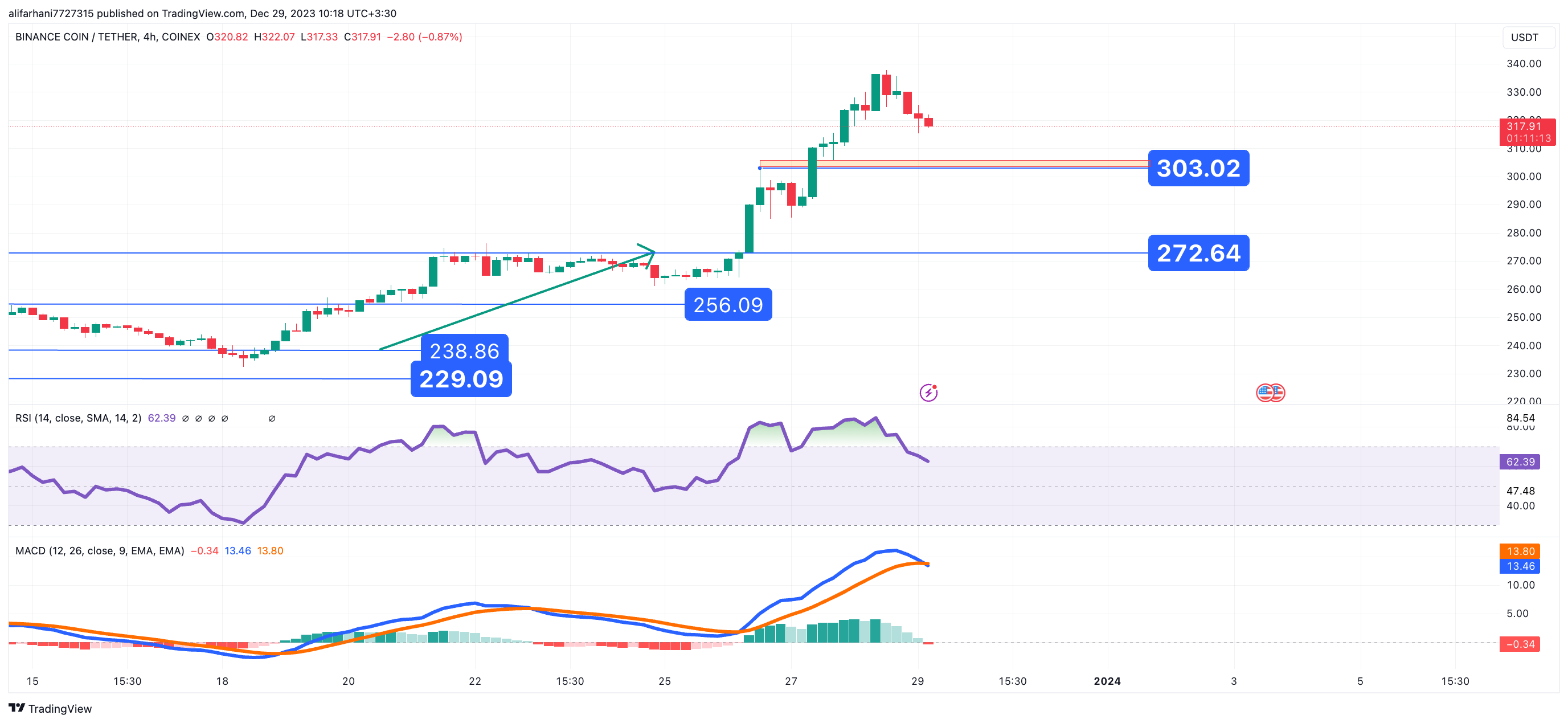 علاوه بر این، توکن بایننس کوین در 30 روز گذشته افزایش خارقالعاده 45 درصدی را ثبت کرده است. در حال حاضر، ارزش بازار بایننس کوین 50.02 میلیارد دلار است که 11 درصد افزایش یافته است. علاوه بر این، حجم معاملات 24 ساعته این رمزارز با 2.14 درصد افزایش به 2.09 میلیارد دلار رسید.افزایش قیمت اخیر را می توان با تحولات مثبت مختلف اخیر در اکوسیستم بایننس، از جمله معرفی حالت انتقال خودکار ایزوله، مرتبط دانست. همچنین بایننس کوین از میانگین متحرک نمایی 20 روزه (262 دلار) در 25 دسامبر افزایش یافت و در 26 دسامبر بالای خط گردن اوج گرفت و یک الگوی صعودی معکوس سر و شانه ها را تکمیل کرد.