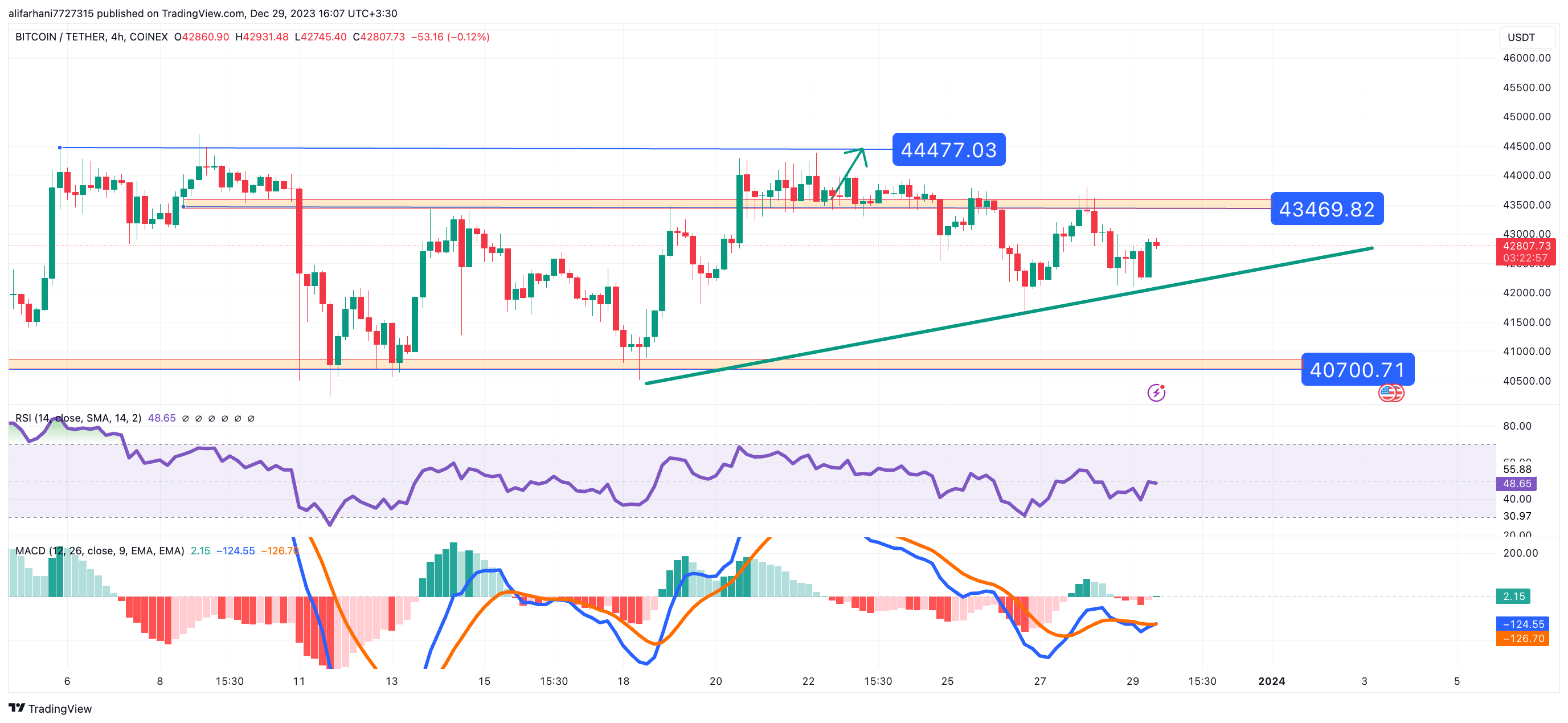 از آنجایی که بیت کوین با افزایش فعالیت خریدار در میان گمانه زنی ها در مورد تایید ETF بیت کوین نقطه توجه را به خود جلب می کند، معامله گران با احتیاط بیشتری نسبت به کاهش احتمالی قیمت بیت کوین هشدار می دهند و پیش بینی ها به اصلاح موقت تا 40000 دلار اشاره می شود، با ورود این ارز دیجیتال به سال جدید در سال 2024، بین سطح حمایت 40000 دلار و مقاومت در برابر 44000 دلار در نوسان است.در همین حال، انتظار می رود مسیر قیمت بیت کوین در سه ماهه آینده به تصمیم کمیسیون بورس و اوراق بهادار ایالات متحده (SEC) در مورد تایید ETF بیت کوین بستگی داشته باشد. پیش بینی می شود SEC تا مهلت آزمایشی 10 ژانویه 2023 تأییدیه های ETF را اعلام کند.