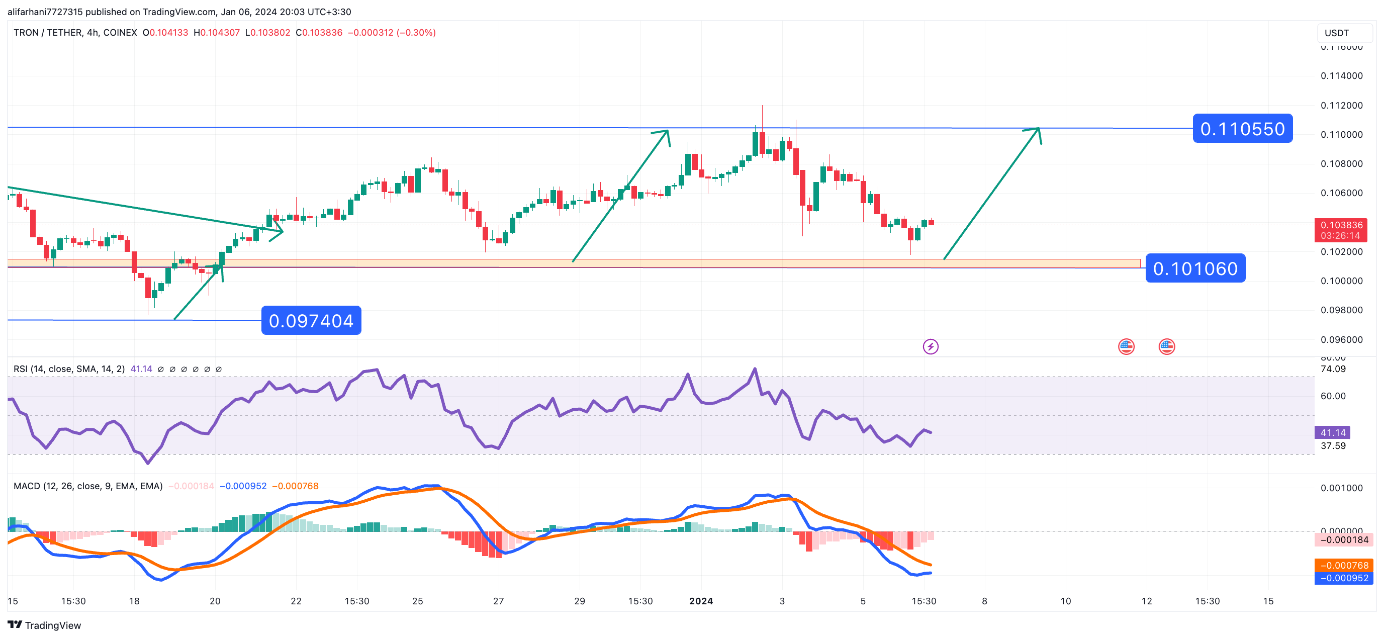 اما در تایم فریم ۴ ساعته اگرچه برای خریداران ارزهای دیجیتال بسیار نامطلوب بود، اما قیمت امروز یک بار دیگر پس از برخورد با سطح حمایت مورد نظر در محدوده قمیت 0.101 دلار به سرعت افزایش یافت.همچنین شاخص قدرت نسبی (RSI) و MACD روند صعودی مداوم را تأیید می کند زیرا ارزش کلی آن تا 40 افزایش یافته است و در صورت ادامه روند فعلی دستیابی به تارگت و سقف کانال مورد نظر در دسترس خواهد بود