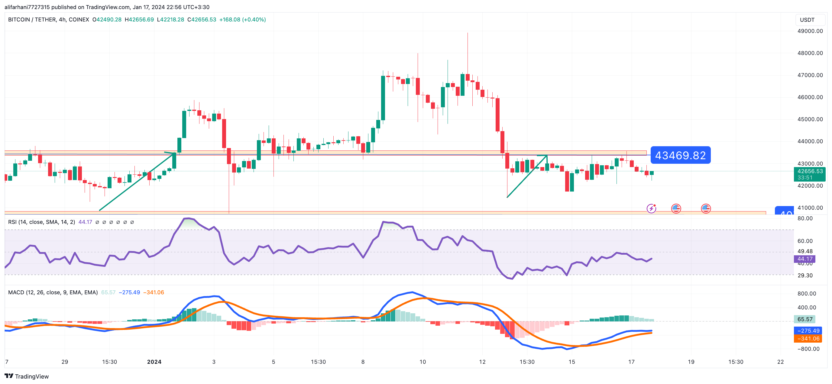 تحلیل تکنیکال بیت کوین (BTC) ۱۴۰۲/۱۰/۲۶،ادامه فاز نوسانی صعودی