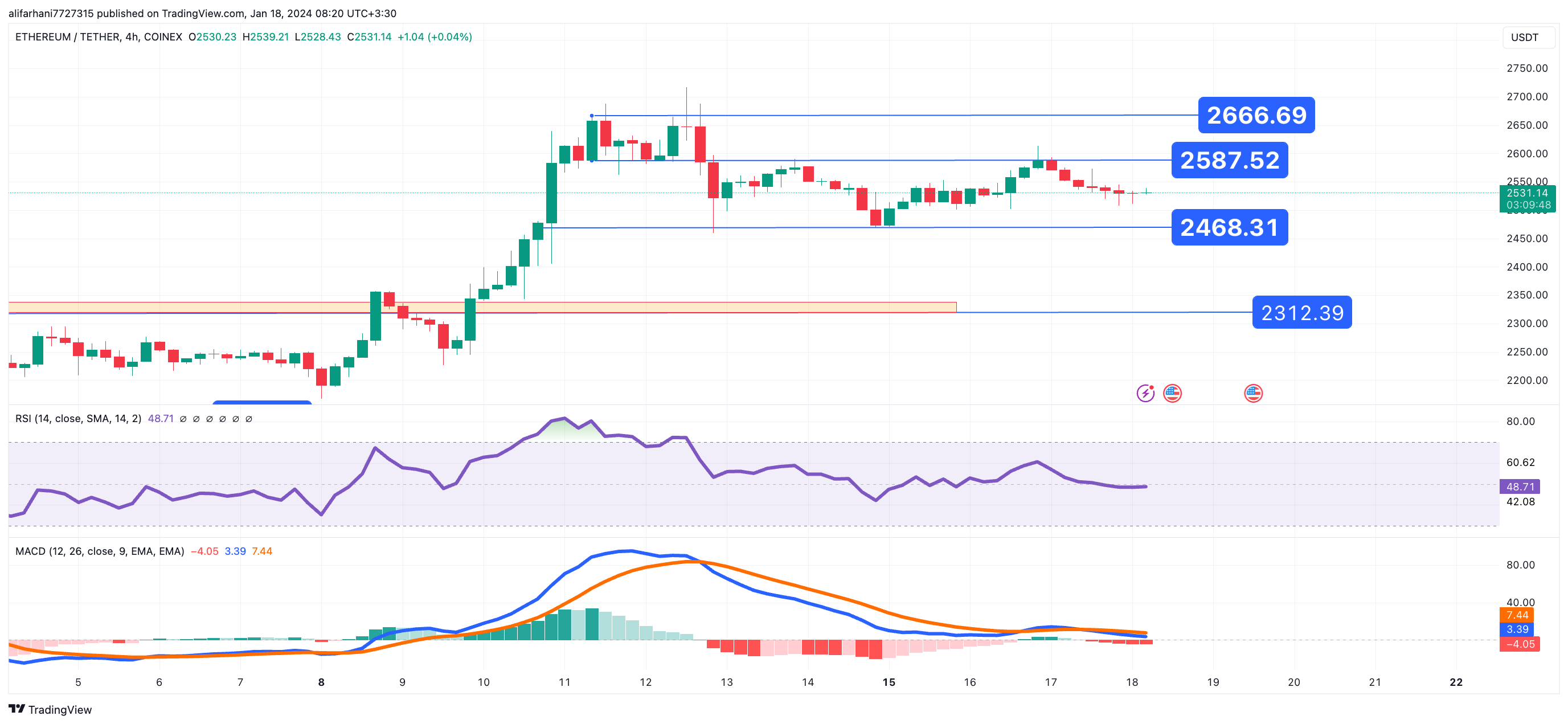 طبق گفته شرکت تحلیلی روی زنجیره ای Santiment، تسلط اتریوم بر بازار بیت کوین افزایش قابل توجهی داشته است. تنها در هفته گذشته، این رقم بیش از 22.4 درصد افزایش قابل توجهی داشته است.در طول این مدت، روزانه به طور متوسط 89.4 هزار آدرس اتریوم جدید تولید میشود که بر محبوبیت روزافزون شبکه تأکید میکند. علاوه بر این، 96.3K کیف پول در 16 ژانویه ایجاد شد.اما در تایم فریم ۴ ساعته با توجه به روند فعلی اندیکاتور های MACD و RSI روند پیش روی اتریوم همچنان خنثی و نوسان در محدوده مورد نظر خواهد بود.