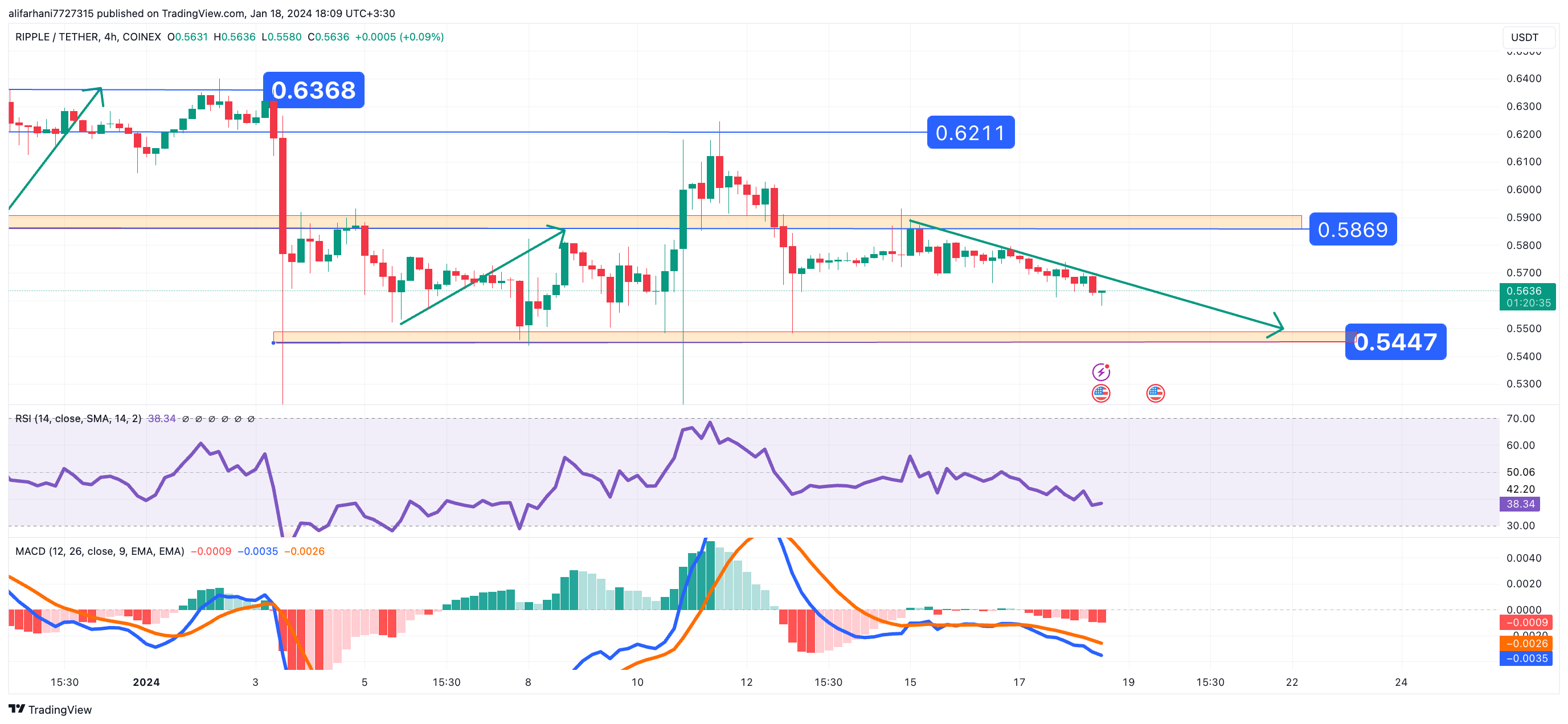 تحلیل تکنیکال ریپل (XRP) ۱۴۰۲/۱۰/۲۷، ادامه فاز نوسانی نزولی