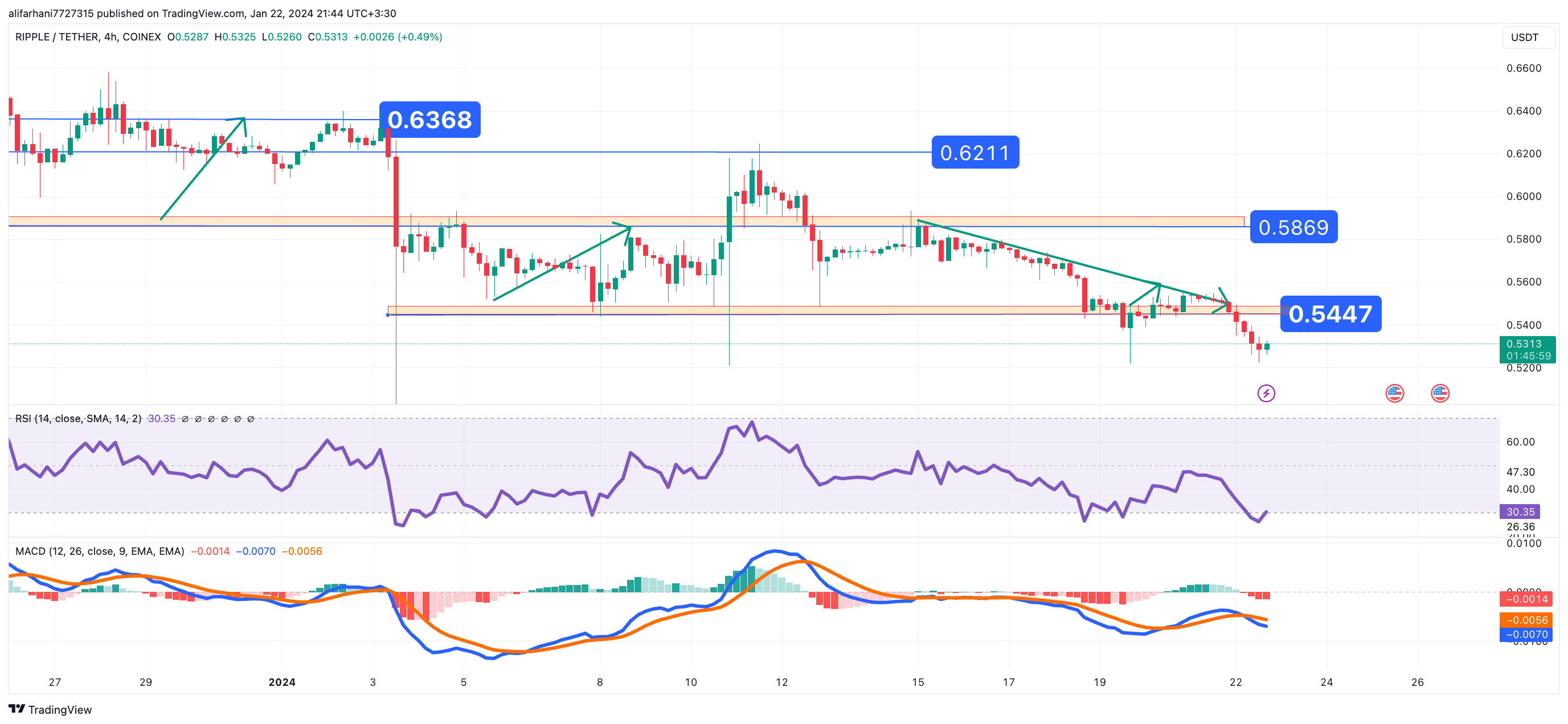 قیمت رپیل از اوایل سال 2023 بهبود تدریجی را تجربه کرده است که توسط خط روند صعودی پشتیبانی می شود. این خط روند به طور موثری در طول رکودهای قابل توجه بازار پشتیبانی را فراهم کرده است و خریداران را تشویق به حفظ یک مسیر صعودی کرده است.قابل توجه است که سکه در سه نوبت از این خط روند صعودی بازگشته است، که نشان دهنده علاقه مستمر سرمایه گذاران به خرید رپیل در طول روند های اصلاحی است،اگر رپیل در روزهای آینده جایگاه خود را بالاتر از این سطح حمایت 0.5447 حفظ کند، سرمایه گذاران می توانند حرکت صعودی بیشتری را پیش بینی کنند و روند نوسانی موجود را ادامه دهند.اگر قیمت رپیل از خط روند سربار خود بشکند، می تواند باعث افزایش خرید شود و به طور بالقوه قیمت ها را به 0.58 و 0.62 دلار برساند. در مقابل، شکستن زیر خط روند پایین ممکن است نشان دهنده یک تغییر نزولی باشد و احتمالاً قیمت ها را به 0.47 دلار و 0.42 دلار کاهش دهد، زیرا فروشندگان در بازار تسلط پیدا می کنند، اما در حال حاضر با توجه به روند صعودی اندیکاتور ها، محدوده قیمت 0.5447 به اولین تارگت صعودی تبدیل خواهد شد.