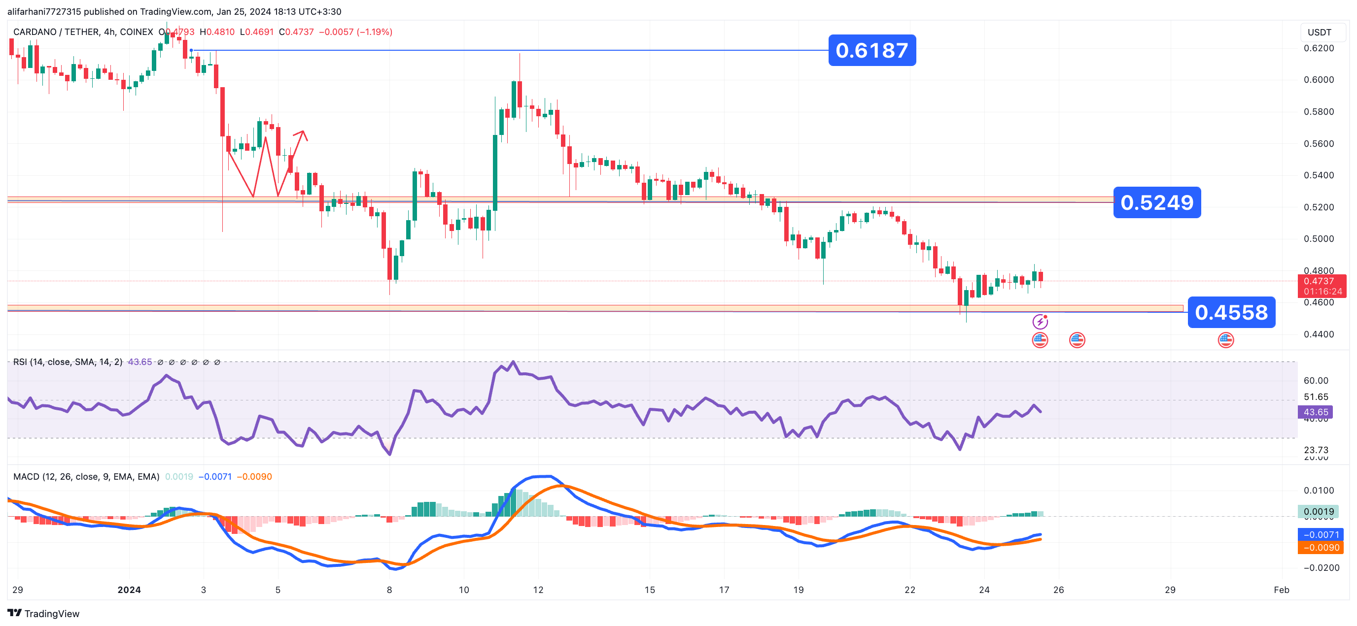 در زمان نوشتن این تحلیل تکنیکال، RSI زیر 40 قرار گرفته است و همچنان در حال ادامه روند نزولی خود می باشد،علاوه بر این، خطوط میانگین متحرک اندیکاتور MACD نیز در تلاش برای تلاقی با یکدیگر می باشند که سیگنالهای نزولی RSI را تأیید میکرد. این روند قیمت غالب نشان میدهد که حجم معاملات برای کاردانو تحت سلطه فعالیتهای فروش است، با افزایش قابلتوجه در دامپ، که به طور بالقوه منجر به کاهش بیشتر قیمت و ادامه روند نوسانی میشود.
