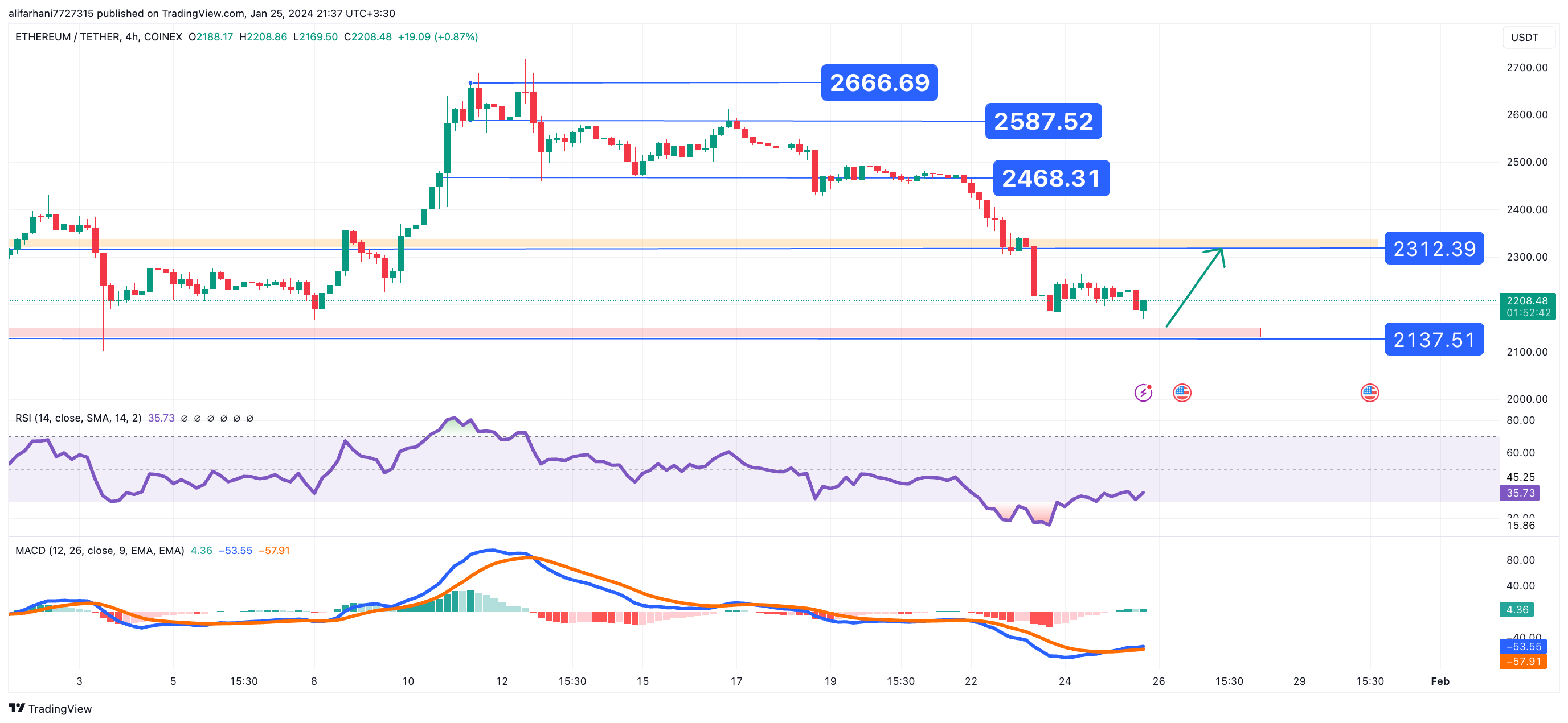 اگر اتریوم بتواند از محدوده قیمت فعلی خود رهایی یابد، هدف بعدی ممکن است خط مقاومت بالای کانال باشد که حدود 2300 دلار تخمین زده می شود. با فشار صعودی پایدار، این رمزارز می تواند در کوتاه مدت به بالاترین سطح 3000 دلار افزایش یابد. با این حال، در نظر گرفتن این نکته ضروری است که افت زیر سطح حمایت، به خصوص در نقطه 2100 دلار، ممکن است روند نزولی را به سمت خط حمایت پایین کانال نزدیک به 2000 دلار آغاز کند.