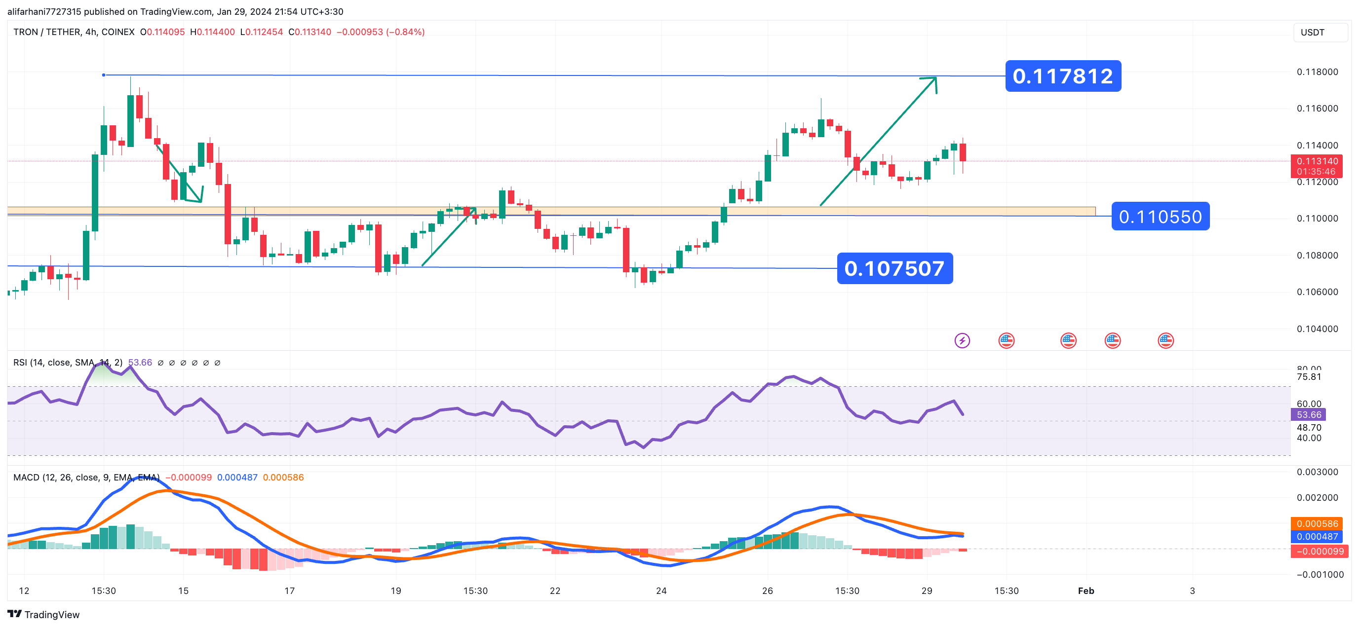 علاوه بر این،در تایم فریم ۴ ساعته نیز ترون رفتار صعودی را نشان میدهد زیرا MACD بالای خط صفر است و خط سیگنال را از پایین قطع کرده است، این یک تلاقی صعودی و پتانسیل افزایش زیادی را در نمودار نشان میدهد و اندیکاتور RSI هنوز به سطح 70 نزدیک نشده است، به این معنی که دارایی هنوز با مقاومت زیادی روبرو نیست و می تواند سود خود را افزایش دهد، این نشان دهنده پتانسیل پیشرفت قیمت نیز است.