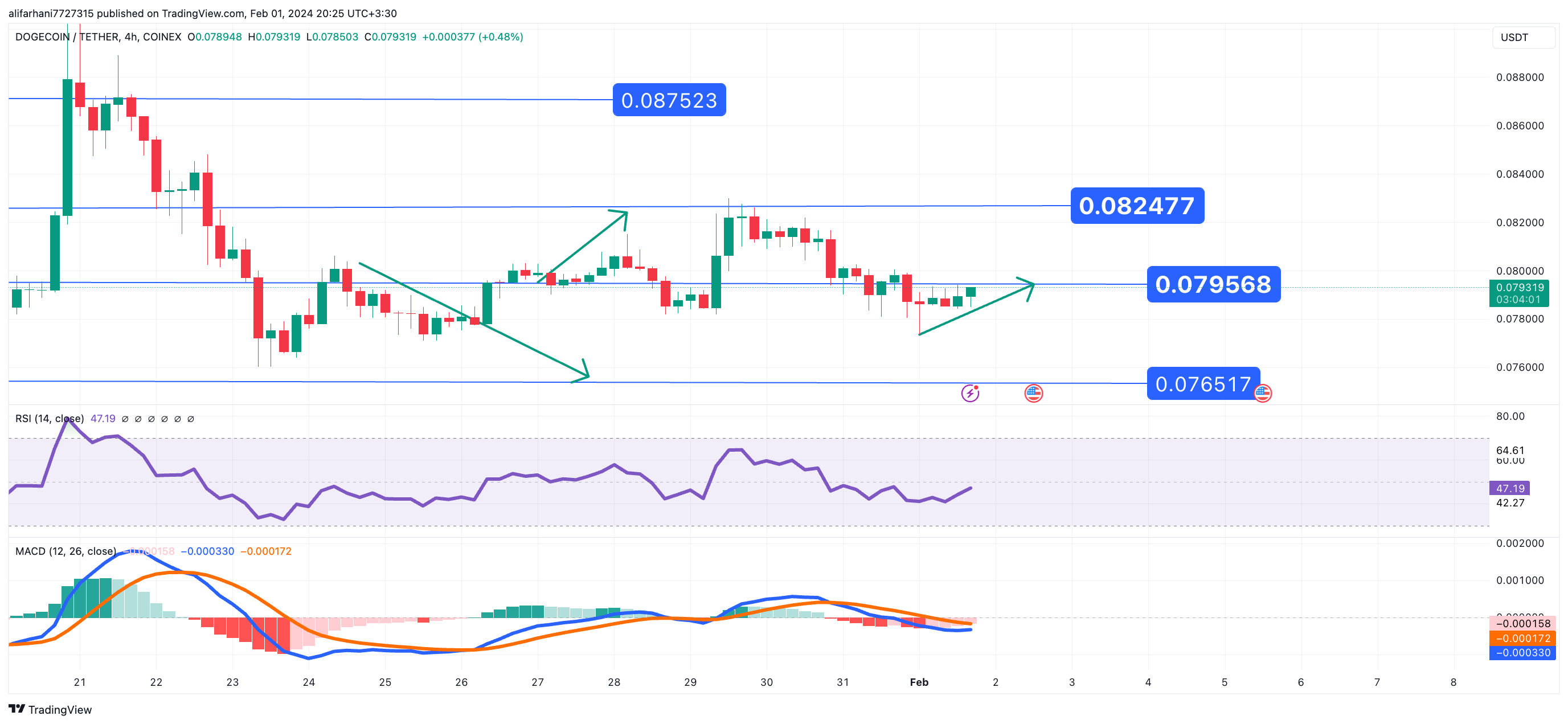 تحلیل تکنیکال دوج کوین ۱۴۰۲/۱۱/۱۰، ادامه روند نوسانی خنثی