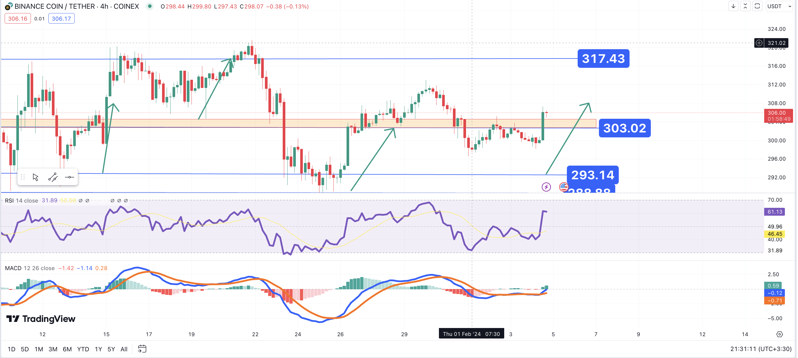تحلیل تکنیکال بایننس کوین (BNB) ۱۴۰۲/۱۱/۱۴،ادامه روند صعودی صعودی