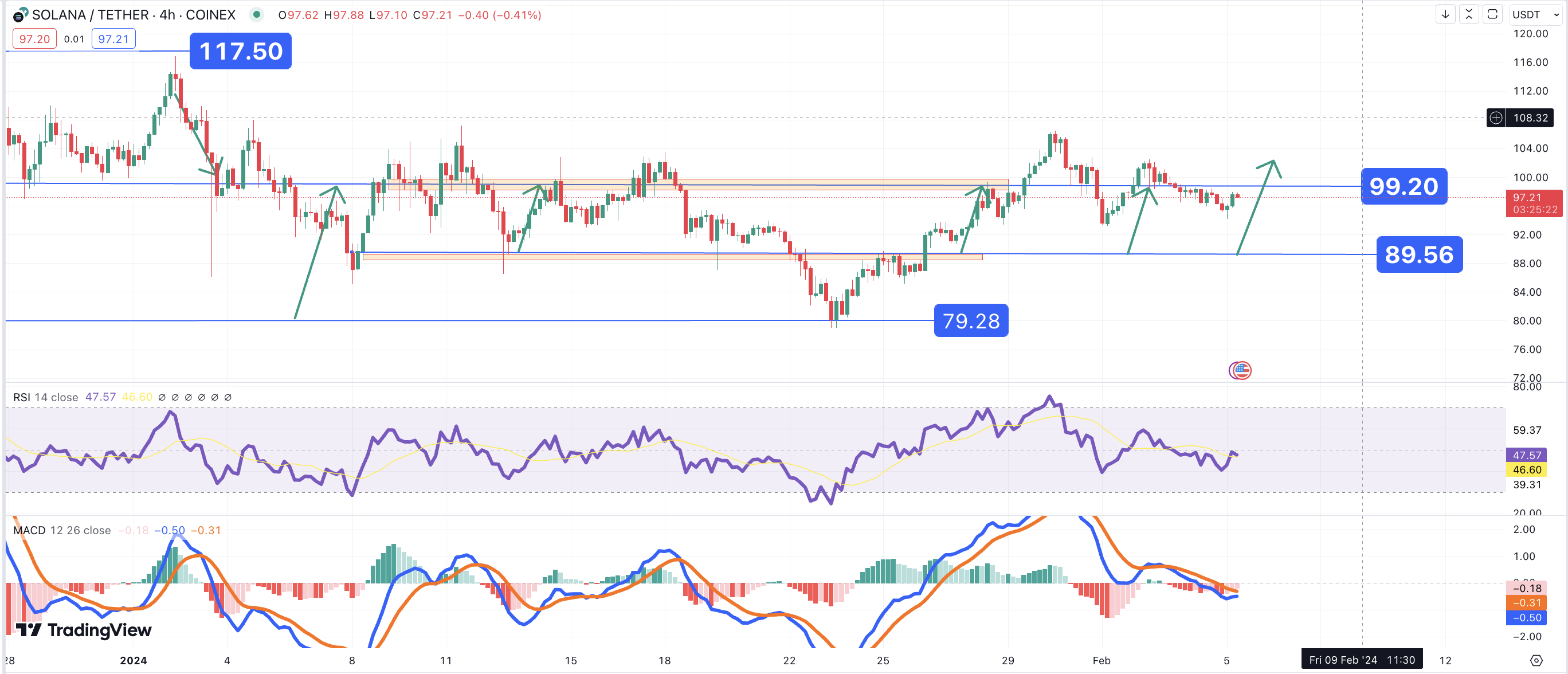 با محبوبیت سولانا، ازدحام شبکه به یک نگرانی فزاینده تبدیل شد. افزایش تقاضا برای تراکنشها و برنامههای غیرمتمرکز (DApps) منجر به ازدحام شد که منجر به کندتر شدن زمان پردازش و کارمزدهای بالاتر شد. علیرغم توان عملیاتی چشمگیر 50000 تراکنش در ثانیه (TPS)، سولانا با چالش های مقیاس پذیری در زمان تراکم شبکه و افزایش حجم بازار همگام با نوسانات اخیر مواجه خواهد بود،از آن زمان، قیمت بین 90 تا 100 دلار معامله میشود که نشاندهنده احساسات ضعیف قیمت برای سولانا است.در حال حاضر، یک شکست کامل به زیر کندل های بحرانی 97.5 دلار، سیگنالهای کاهش پتانسیل را به محدوده قیمت 90 یا 85 دلار میدهد، با پشتیبانی پایه در 78 دلار. یک سناریوی بازگشتی می توانیم شاهد دستیابی به سطوح بالا تر باشیم
