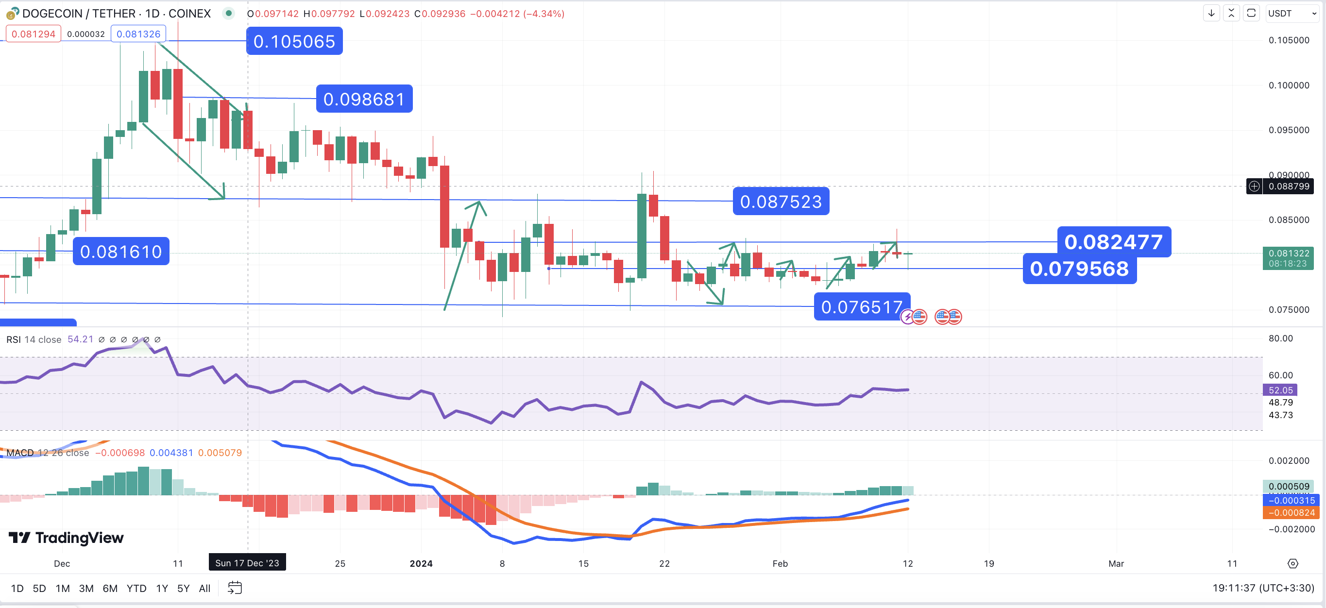 اما در تایم فریم روزانه، قیمت دوج کوین الگوی نوسانی را نشان داده است، به طوری که معاملات بین محدوده 0.07800 دلار و 0.0800 دلار در هفته گذشته رخ داده است.قیمت فعلی دوج کوین 0.080870 دلار است که نشان دهنده کاهش 1.21 درصدی در 24 ساعت گذشته است. با عرضه در گردش 143,014,736,384 واحد دوج و داشتن جایگاه یازدهن طبق CoinMarketcap، دوج حضور خود را در بازار ارزهای دیجیتال حفظ می کند.