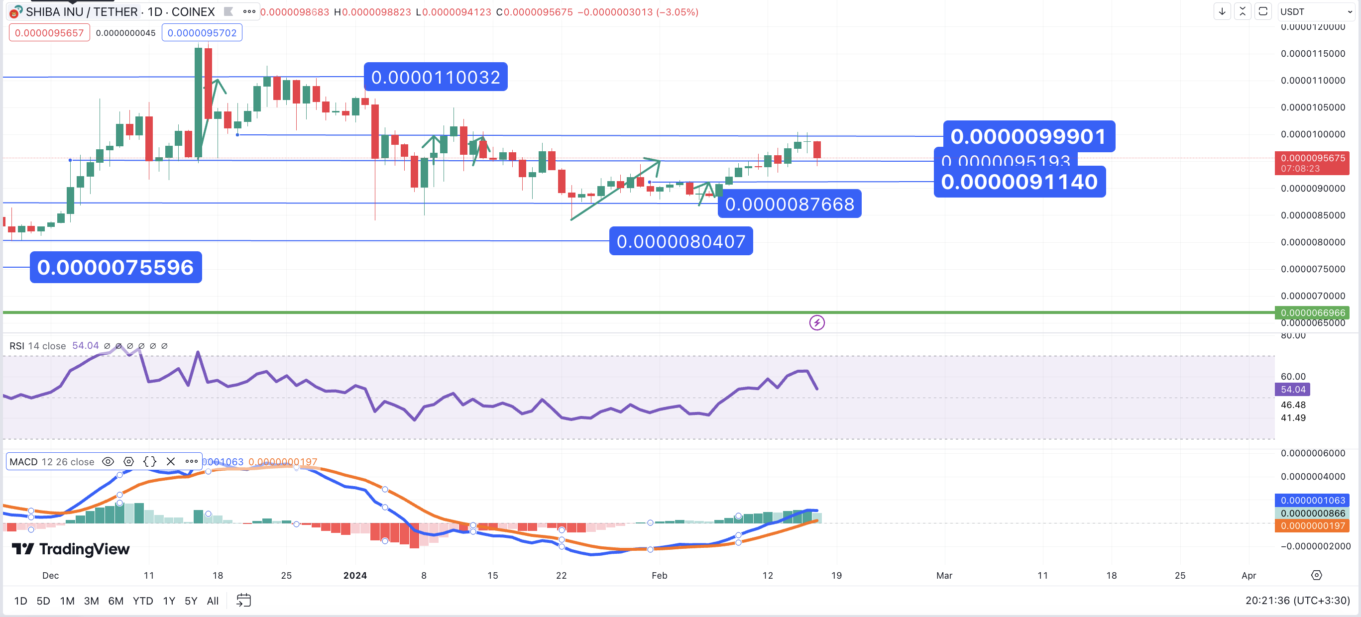 اما در تایم فریم روزانه، در صورت تغییر روند صعودی، شیبا اینو در آستانه شکستن سد 0.00001 دلاری است و حتی ممکن است به 0.00001011 دلار، 0.00001193 دلار و 0.00001309 دلار در بازه ها زمانی بلند مدت تر نیز دست پیدا کند، علاوه بر این، در صورت ادامه روند اصلاحی برای این رمزارز، سطوح پشتیبانی حیاتی را برای شیبا اینو در 0.00000953 دلار، 0.00000896 دلار و 0.00000880 دلار برجسته می کند. این سطوح ممکن است نقش مهمی در حمایت از قیمت شیبا اینو در صورت هر گونه نوسانات بازار داشته باشند.