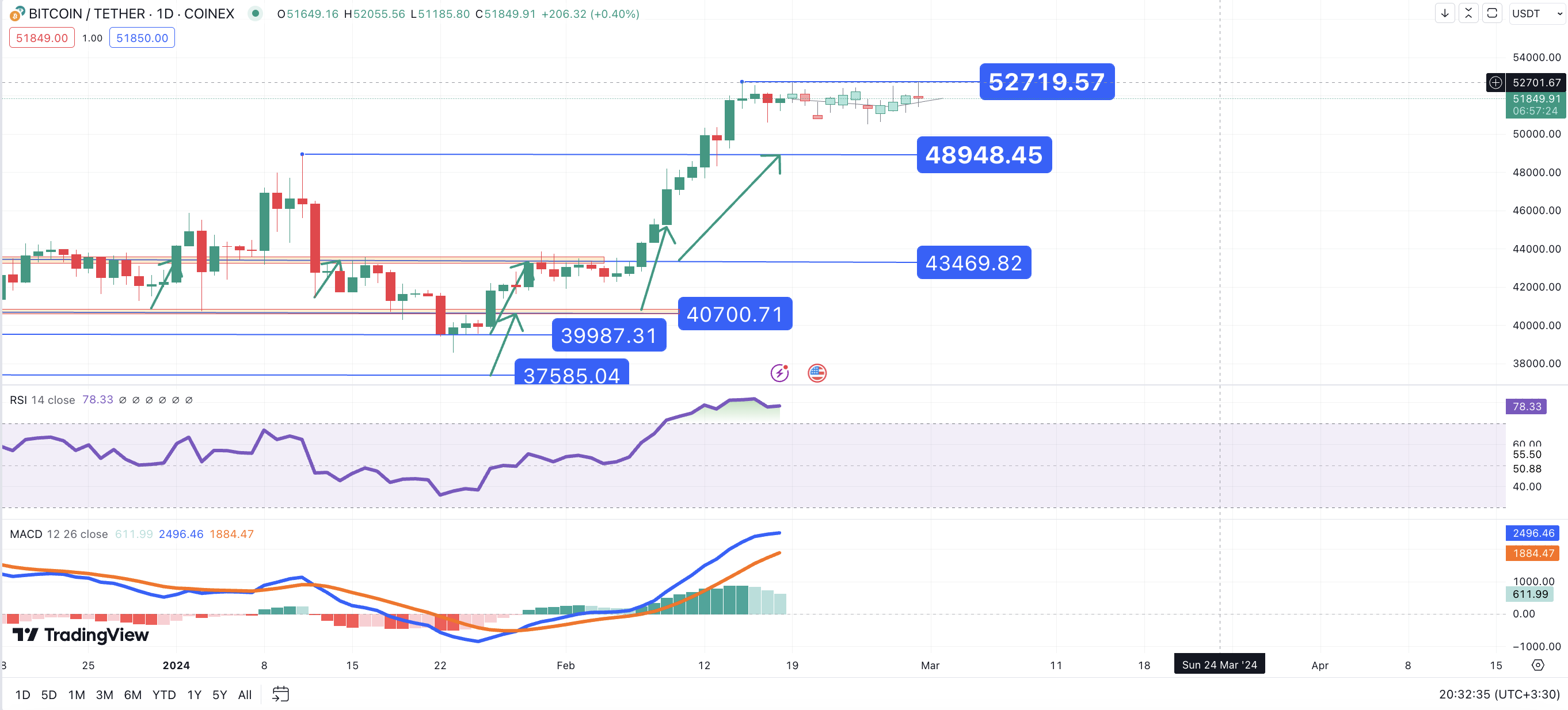 با این حال، با توجه به اینکه بازار گسترده رمزارز، روند پیش رو همچنان صعودی است، یک اصلاح میتواند به خریداران کریپتو نیز اجازه دهد تا قدرت خود را برای رالی بالاتر بازیابی کنند.اما در صورت عقب نشینی احتمالی، حمایت کلیدی مطابق با ابزار اصلاح فیبوناچی در 49458 دلار و به دنبال آن 47400 دلار است که مصادف با 23.6٪ و 38.2٪ FIB است و در حال حاضر با توجه به روند اصلاحی اندیکاتور های بیت کوین، ادامه روند نوسانی احتمال بیشتری خواهد داشت.