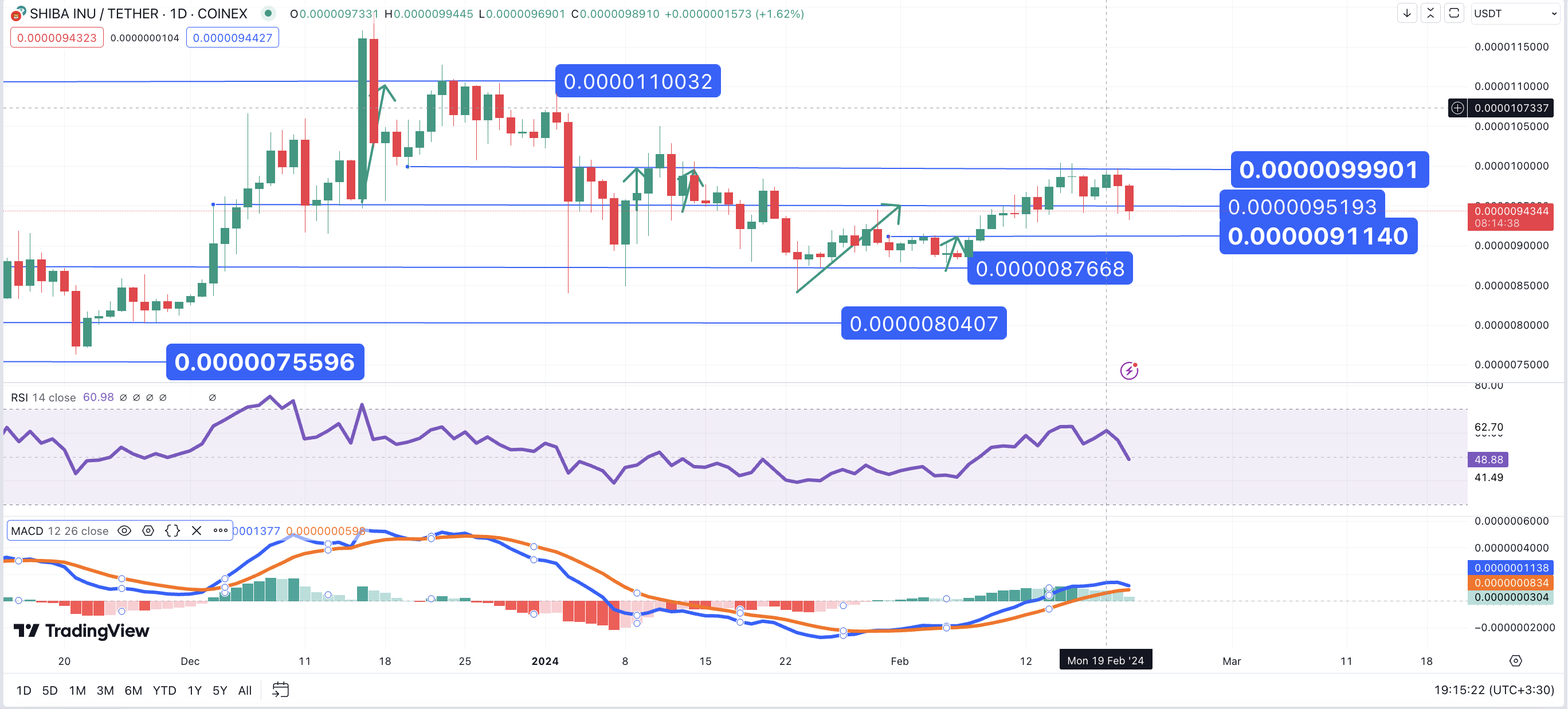 با راه اندازی اخیر صرافی ShibaSwap، شیبا اینو به طور قابل توجهی گسترش می یابد و به دارندگان فرصت هایی برای سهام گذاری و فارمینگ توکن های خود ارائه می دهد.با این وجود شیبا اینو، دومین میم کوین مطرح بازار، شاهد کاهش شتاب صعودی به زیر سطح روانی 0.00001 دلار و اصلاح قیمت بیش از ۵ درصد بوده است. معکوس شدن قیمت این رمزارز از سطح مقاومت پیش رو، یک روند اصلاحی کوتاه مدت را به ما نشان می دهد،تجزیه و تحلیل نمودار بازه زمانی روزانه نشان میدهد که روند میانمدت قیمت شیبا اینو تحت تأثیر یک خط روند صعودی صعودی است. پشتیبانی پویا از اواخر اکتبر 2023 آغاز شده است و در ابتدای سال 2024 نیز این روند صعودی ادامه یافته است.