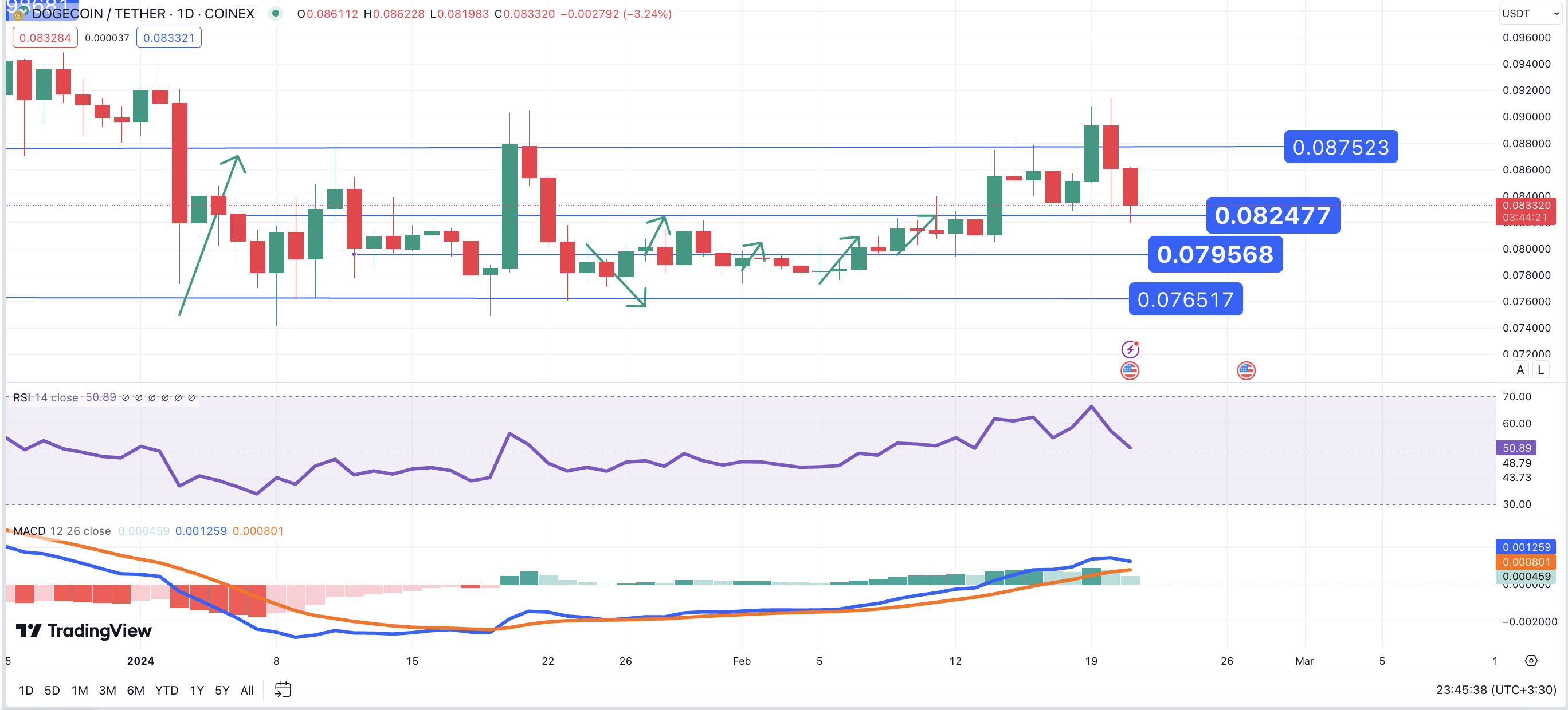 نمودار روزانه نشان می دهد که دوج کوین از ژوئن در یک کانال موازی رو به افزایش معامله می شود و در ابتدا در نوامبر 2023 بالای کانال شکست اما اندکی بعد دوباره به کانال بازگشت. علیرغم افت، این رمزارز به خط میانی کانال صعود کرد و اکنون در تلاش است از خط روند مقاومت 0.0875 دلار بگذرد و مجددا بالاتر از تارگت 0.1 دلاری خود تثبیت شود، اما سطح اصلاحی فیبو 78.6% در 0.09 دلار نیز باعث کاهش قیمت در 12 ساعت گذشته شد. دوج کوین بار دیگر با قیمت 0.083 دلار معامله شد و آزمایش مجدد منطقه مقاومت سابق نشان داد که این یک فرصت خرید برای معامله گران کوتاه مدت است و در صورت ادامه فاز اصلاحی در اندیکاتور های MACD و RSI ، محدوده قیمت 0.0795 دلار به اولین تارگت نزولی در این بازه زمانی تبدیل خواهد شد.
