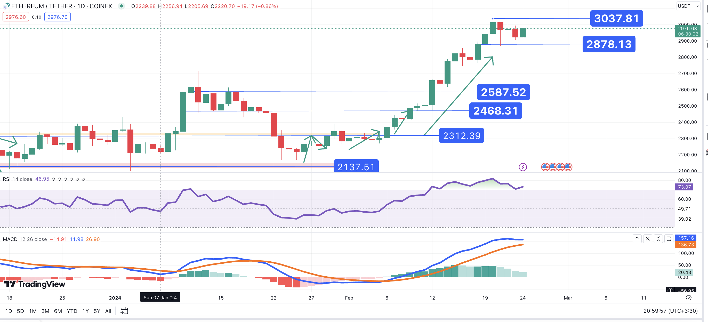 اما در تایم فریم ۴ ساعته، با توجه به تثبیت قیمت بیت کوین، قیمت اتریوم شاهد عرضه سربار 3030 دلاری بوده است. این تجمیع را می توان از کندل روزانه 20 فوریه با سطح بالا و پایین 3030 دلار و 2875 دلار مشخص کرد. بنابراین، قیمت اتریوم از مقاومت سربار 3030 دلار عبور کرد که نشان دهنده ادامه روند بهبود است. رالی این رمزارز پس از شکست سطح مورد نظر قیمت را به 3280 دلار خواهد رساند و 10 درصد سود احتمالی را ثبت خواهد کرد.اما از سوی دیگر با توجه به روند اصلاحی اندیکاتور های MACD و RSI احتمال اصلاح روند بسیار بالا خواهد بود.