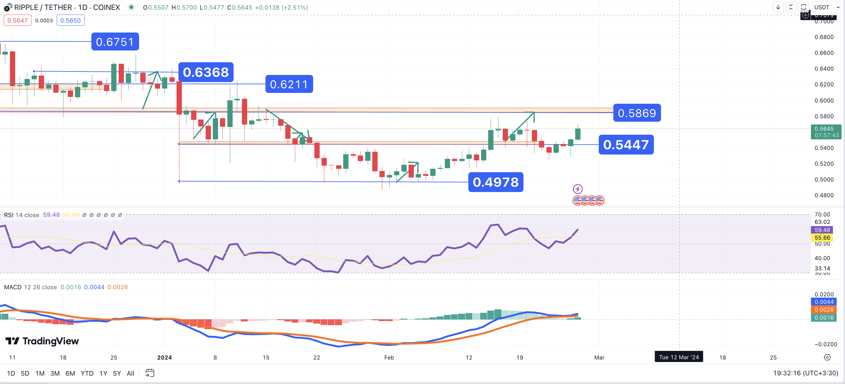 تحلیل تکنیکال ریپل (XRP) ۱۴۰۲/۱۲/۰۸، ادامه فاز صعودی صعودی