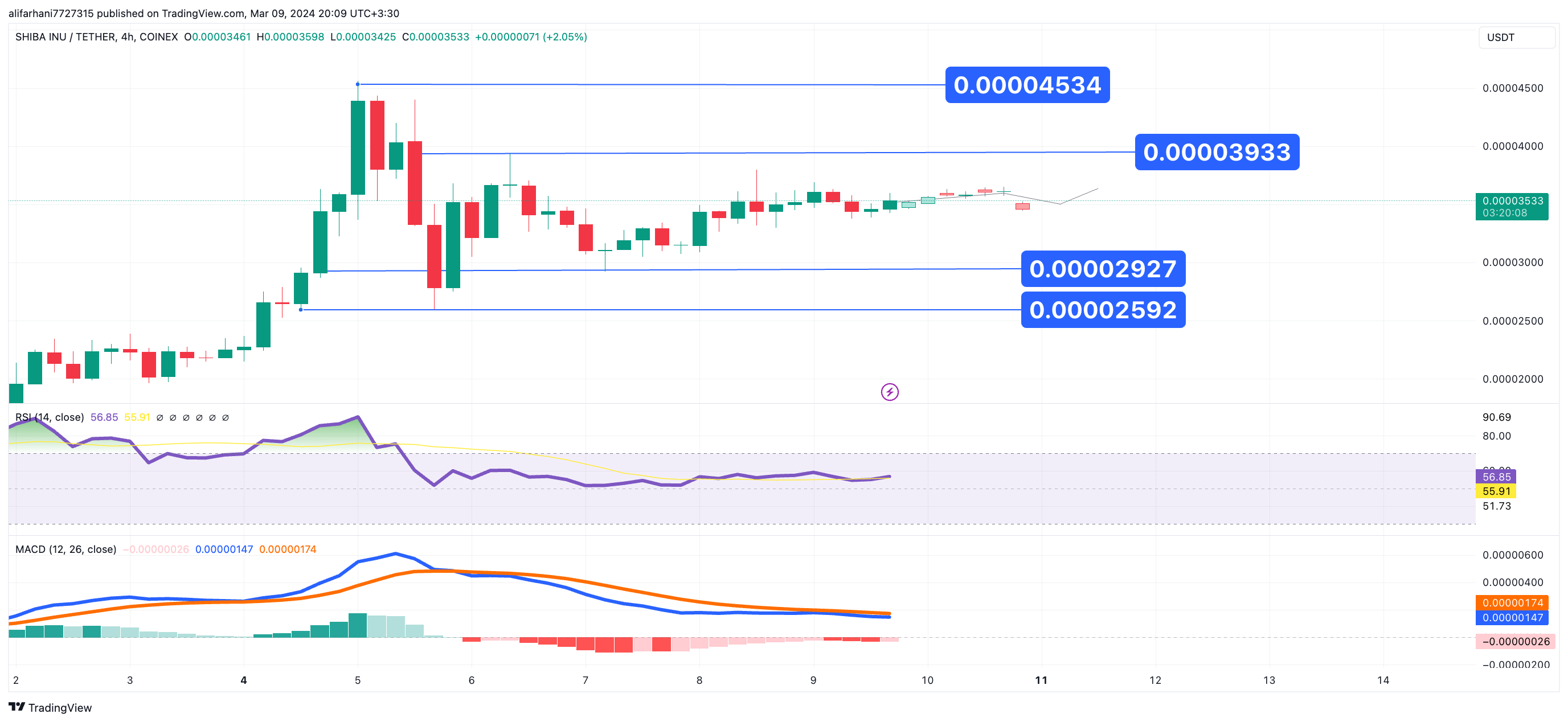 با وجود این موانع، شیبا اینو در هفتههای اخیر حرکت صعودی را نشان داده و به بالاترین سطح 52 هفته گذشته 0.00004534 دلار رسیده است. رشد سالانه تا به امروز به طور قابل توجهی در 238.94٪ است، که نقطه عطفی قابل توجه است زیرا SHIB حمایت خود را بالای 0.00001 دلار تثبیت می کند.