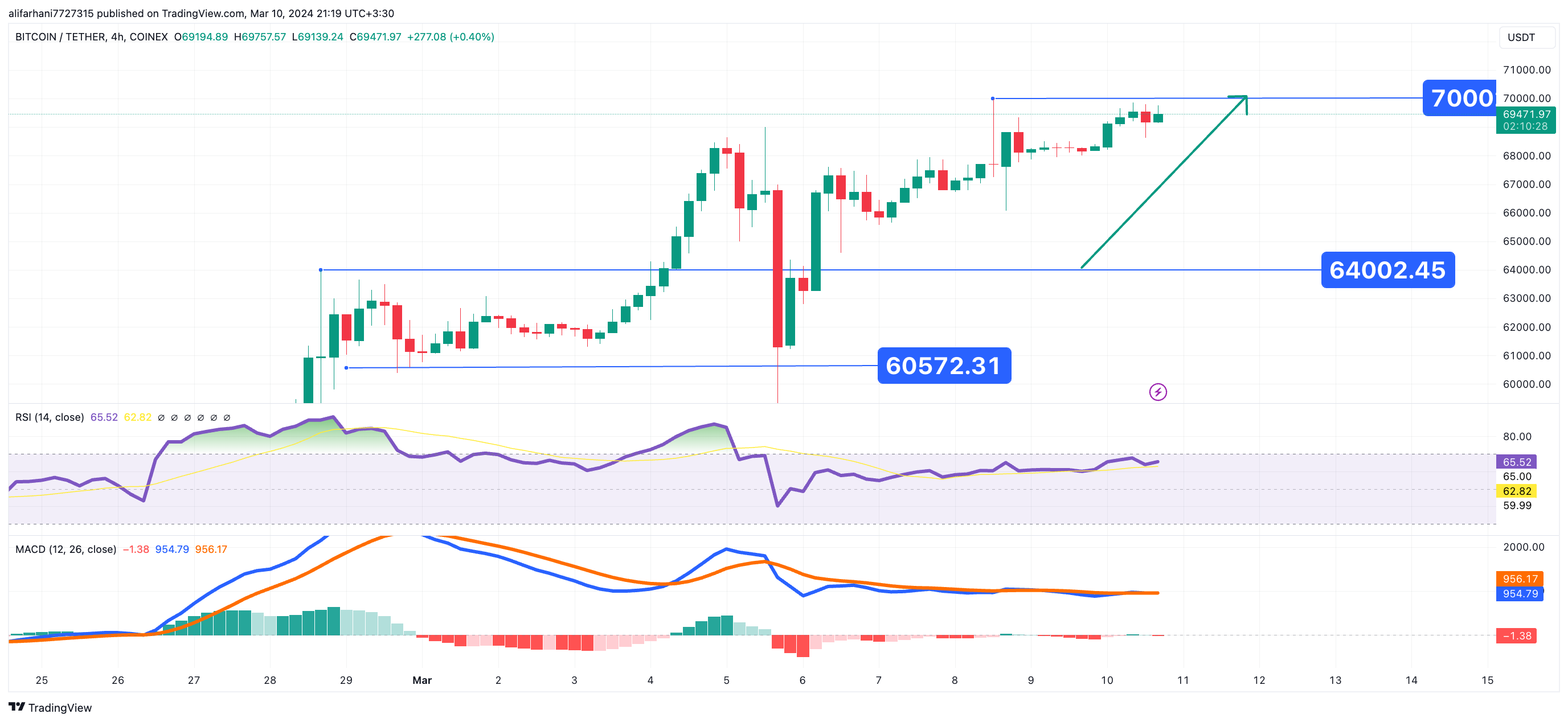 اما در تایم فریم ۴ ساعته، با وجود افزایش امروز، قیمت این رمزارز در نمودار ساعتی صعودی باقی می ماند. در حال حاضر، نزدیک به سطح مقاومت محلی 69981 دلار است.اگر نهنگ ها بتوانند ابتکار عمل را حفظ کنند، احتمال شکست و سپس حرکت به منطقه 70000 دلاری و بالاتر وجود دارد.اما در سوی دیگراگر یک اصلاح قیمت اتفاق بیفتد، بیت کوین ممکن است شاهد حمایت قوی کوتاه مدت در نزدیکی مرز 66 تا 65 هزار دلار باشد. نکته قابل توجه، اندیکاتور MACD نشان داد که گاوها و خرس ها در زمان نگارش این تحلیل تکنیکال در تلاش برای غلبه بر یکدیگر بودند.نمودار 4 ساعته بیت کوین همچنین نشان میدهد که شاخص قدرت نسبی آن (RSI) در آستانه ورود به منطقه خرید بیش از حد است. اگر این اتفاق بیفتد، فشار فروش ممکن است افزایش یابد و ارزش بیت کوین می تواند حمایت آن را تحت تاثیر قرار دهد.