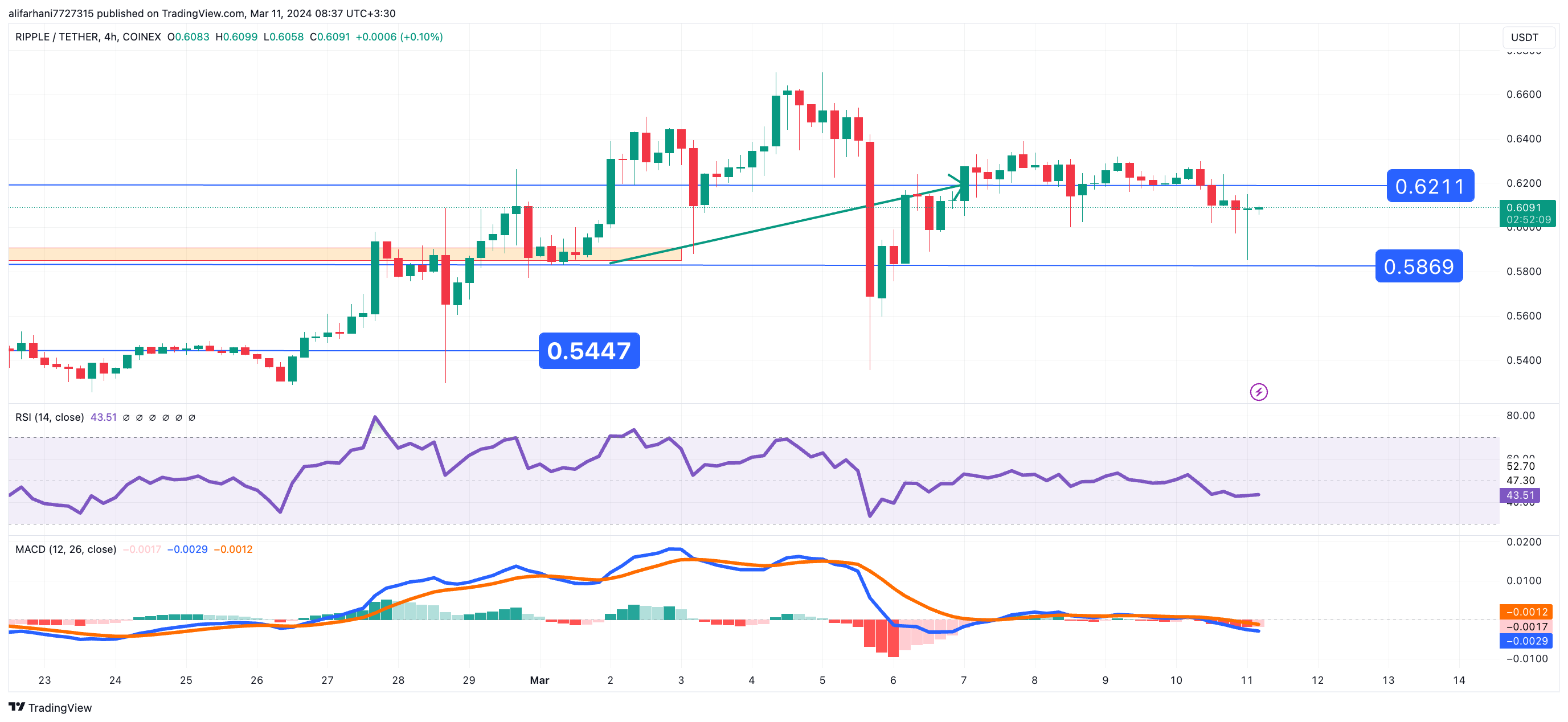 اما در تایم فریم روزانه،کارشناسان پیشنهاد می کنند که برای تثبیت روند صعودی، ریپل باید اصلاح کوتاه مدتی را تجربه کند و به طور مستمر بالاتر از سطح مقاومت 0.6201 دلار باقی بماند. با وجود این، آشفتگی های اخیر بازار دشواری ریپل را برای حفظ چنین پیشرفتی نشان داده است، که منعکس کننده تأثیر سریعی است که نوسانات بازار بر پیش بینی های فنی دارد.در حال حاضر، عملکرد ریپل در محدوده منفی قرار دارد، با افت جزئی در فواصل ساعتی، روزانه و هفتگی. این کاهش ها نشان دهنده عدم قطعیت و چالش های مداومی است که ارز دیجیتال با آن مواجه است.