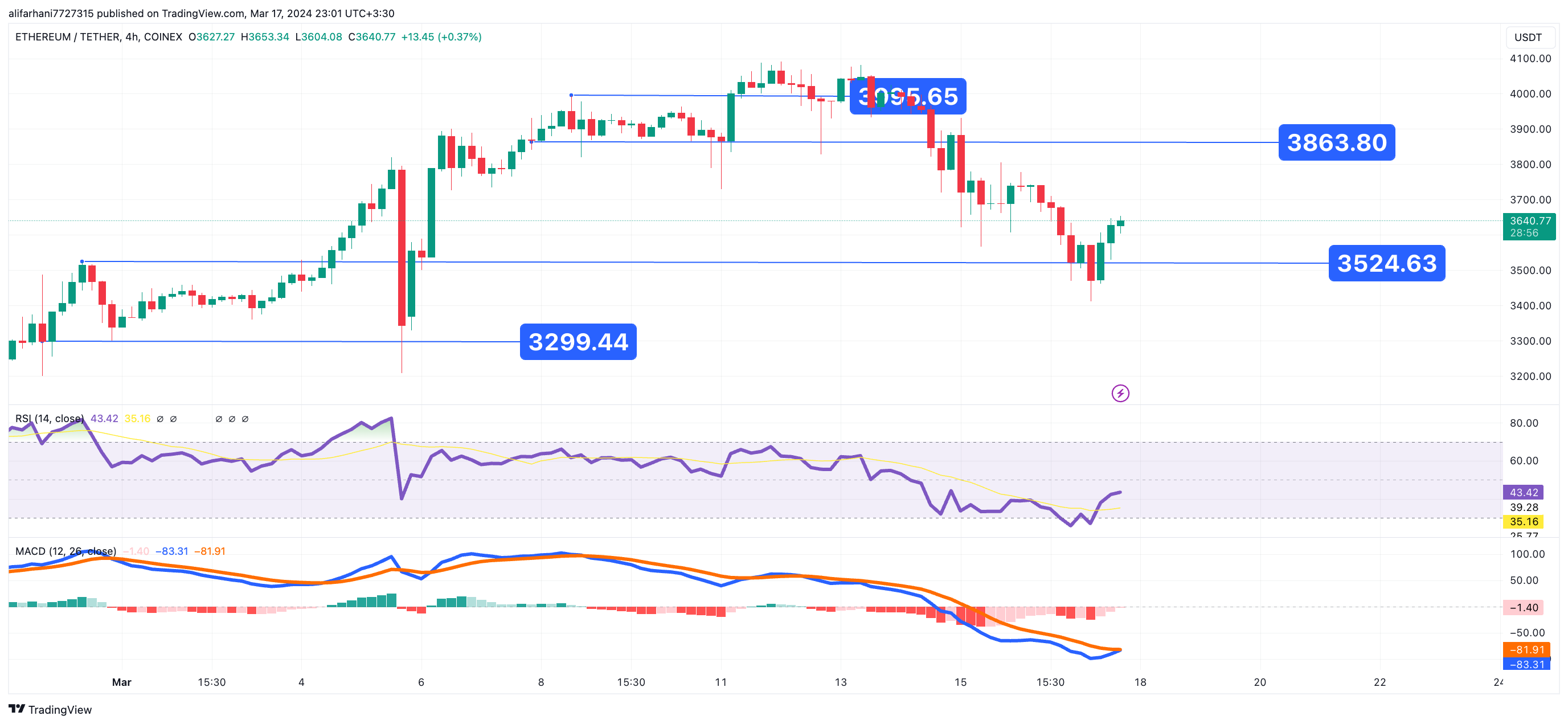 قیمت اتریوم در اوایل این هفته از 4000 دلار گذشت اما از آن زمان تا کنون 500 دلار کاهش یافته است. علیرغم عقب نشینی های اخیر در بازار کریپتو، روند کلی در چند ماه گذشته کاملاً صعودی بوده است که منجر به بالاترین قیمت بیت کوین و اوج چندین ساله اتریوم شده است.اگرچه اتریوم اوج سال 2021 خود را نشکسته است، اما اخیراً در حال افزایش بوده و برای مدت کوتاهی از 4000 دلار عبور کرده است. با این حال، عقب نشینی های بازار که در بالا ذکر شد، قیمت اتریوم را در حال حاضر به حدود 3500 دلار کاهش داده است. علاوه بر این، در حالی که بیت کوین به دلیل ساختار برنامه ریزی شده اش ذاتا تورمی است، اتریوم می تواند به دنبال به روز رسانی دنیسون به دارایی کاهش تورم تبدیل شود. همچنین در این تایم فریم، با توجه به تلاقی خطوط سیگنال در اندیکاتور MACD ، احتمال تغییر فاز صعودی بسیار بالا خواهد بود، همچنین در صورت تثبیت روند فعلی اندیکاتور RSI بالاتر از سطح ۵۰ تثبیت شود، روند صعودی جدید تایید خواهد شد.